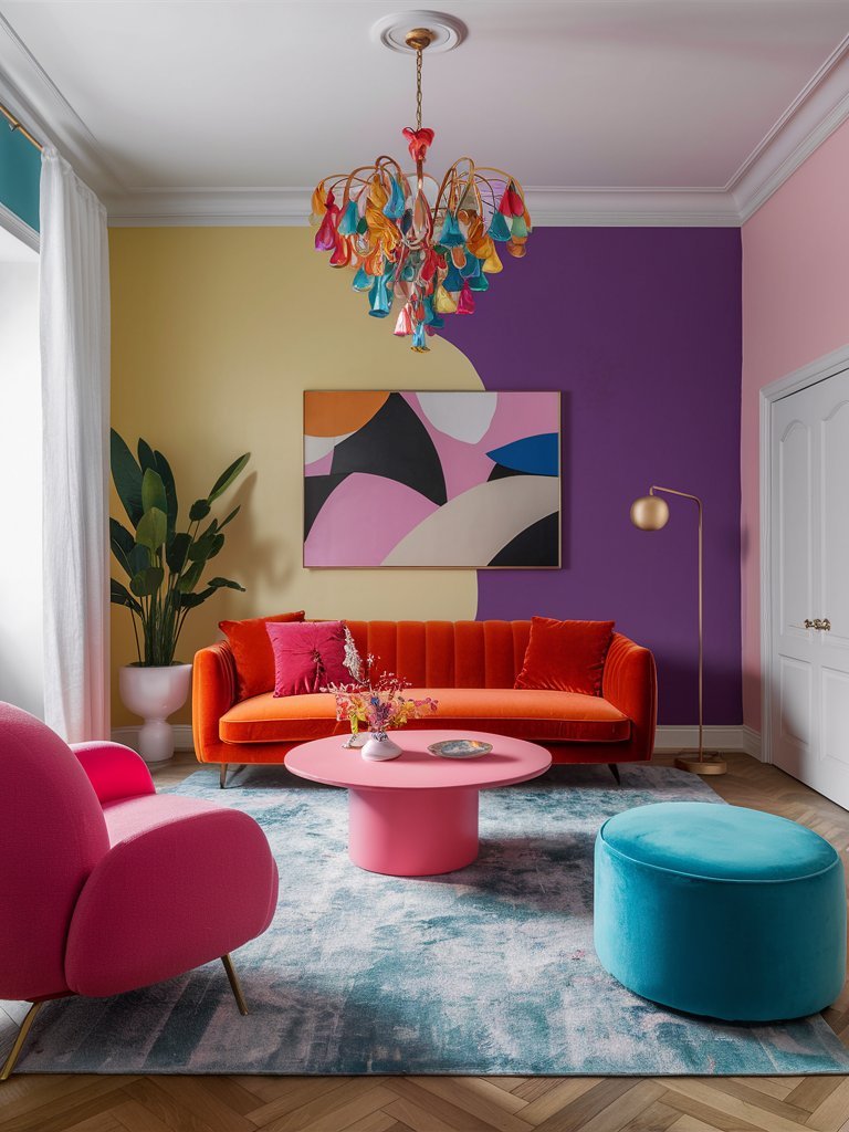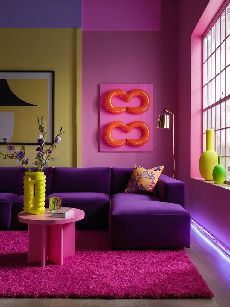 Accessories are strategically chosen to complement the bold color scheme without overwhelming the space. The yellow vase on the pink coffee table introduces a pop of contrast, reinforcing the room’s vibrant theme. The patterned throw pillow on the sofa adds an element of whimsy, while the neon orange wall art serves as a sculptural focal point. Together, these details elevate the decor, adding depth and personality.