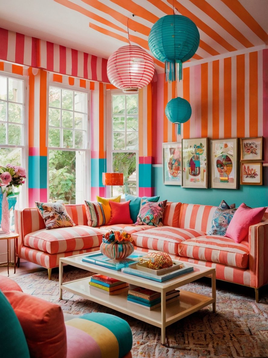 The room’s bold use of patterns is a testament to its fearless design. The vertical and horizontal stripes on the walls and ceiling create a dramatic effect, drawing the eye upward and giving the space a whimsical, almost circus-like quality. The striped pattern on the sofas harmonizes with the overall theme, reinforcing the design’s continuity. While such a strong pattern could easily overwhelm, the thoughtful balance of colors and the repetition of stripes create a cohesive look that feels curated rather than chaotic. This creative pattern integration is a cornerstone of dopamine decor, emphasizing visual excitement and individuality.