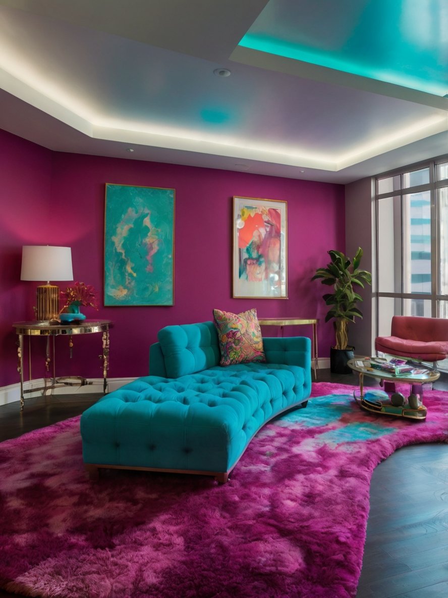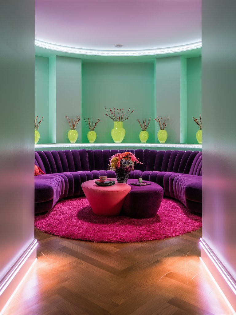 The room’s integrated LED lighting is a standout feature, providing a soft, even glow that enhances the vibrancy of the colors. Positioned along the ceiling and floor, the lighting creates a futuristic and immersive ambiance. This thoughtful lighting design ensures the room remains well-lit without overpowering the bold decor elements. It highlights the architectural features while enhancing the mood, proving that lighting is just as important as color in dopamine decor.