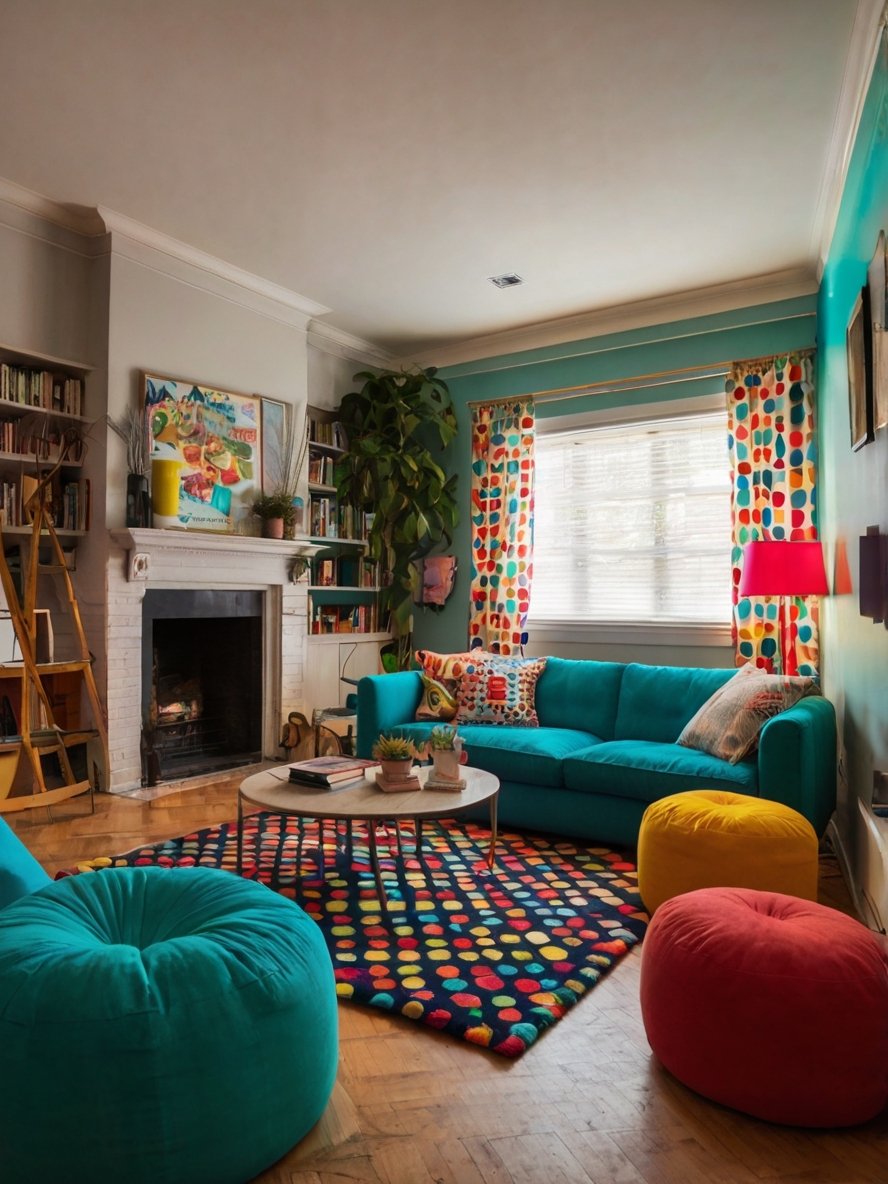 The seating in this living room is designed for comfort and interaction. The turquoise sofa offers a vibrant focal point, while the bean bag chairs add a casual, laid-back vibe. The rounded forms of the seating pieces contribute to the room’s playful aesthetic, softening the space and making it feel inviting. The use of contrasting colors, like the yellow pouf against the turquoise sofa, adds visual interest while encouraging relaxation and conversation. The seating arrangement revolves around the circular coffee table, fostering a sense of community and intimacy.