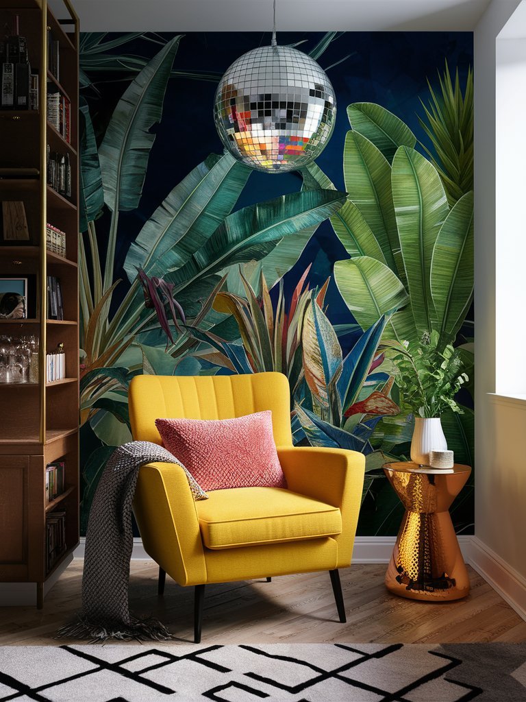 The tropical-themed wall mural is the standout feature in this dopamine-inspired living room. Its vibrant green foliage set against a deep navy background immediately captures attention, creating a bold and lively ambiance. The detailed and realistic illustration of leaves adds depth and texture to the space, transporting the viewer to an exotic jungle retreat. This mural not only anchors the room but also sets the tone for the rest of the decor, embodying the essence of dopamine decor by bringing the vibrancy of nature indoors.