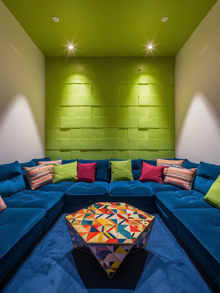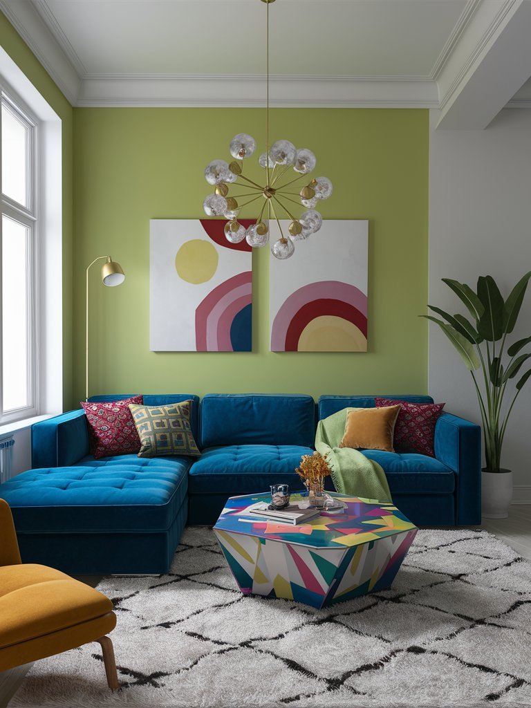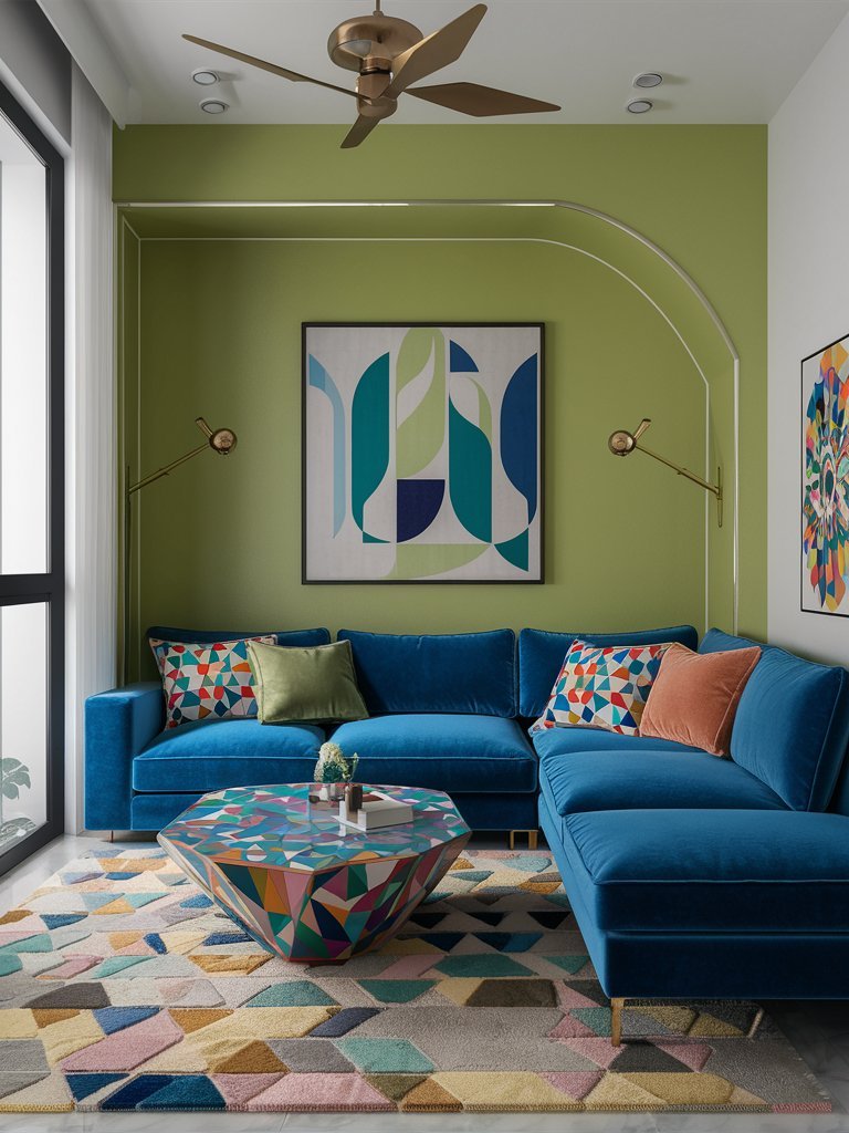 This room’s bold use of color blocking instantly grabs attention. The lime green wall, paired with the equally vibrant green ceiling, creates a lively and energetic backdrop. It contrasts strikingly with the deep blue sofa and carpet, delivering a balanced yet vibrant aesthetic. The bold colors evoke energy and positivity, staying true to the dopamine decor philosophy. The combination of green and blue also creates a refreshing atmosphere, stimulating creativity and joy in the space.
