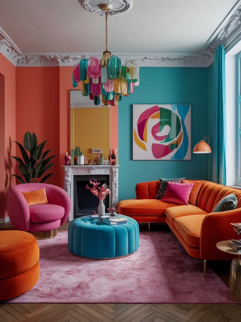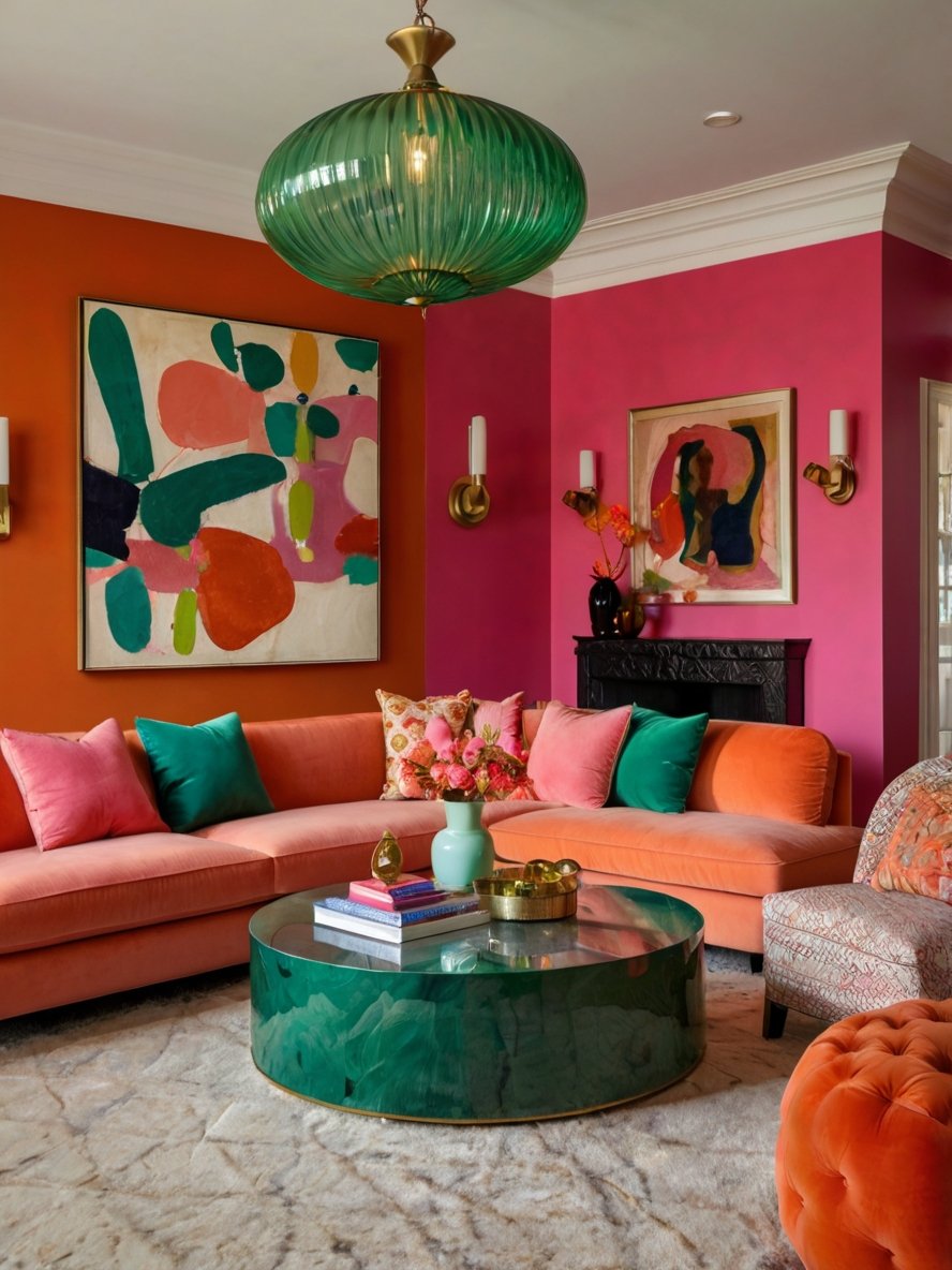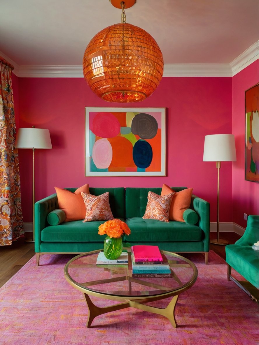 This living room exemplifies dopamine décor through its fearless use of bright and bold colors. The hot pink walls immediately set a playful and cheerful tone, while the contrasting green accents on the adjoining wall add depth and balance. The vibrant orange furniture pieces harmonize beautifully with the walls, creating a warm and inviting atmosphere. This color combination is not for the faint-hearted, it celebrates creativity, joy, and the uplifting power of color. The contrasting hues create visual stimulation that energizes the space while maintaining harmony.