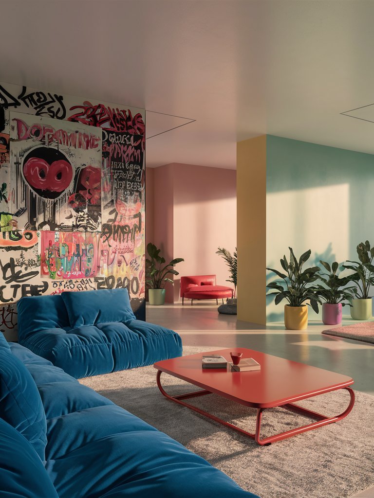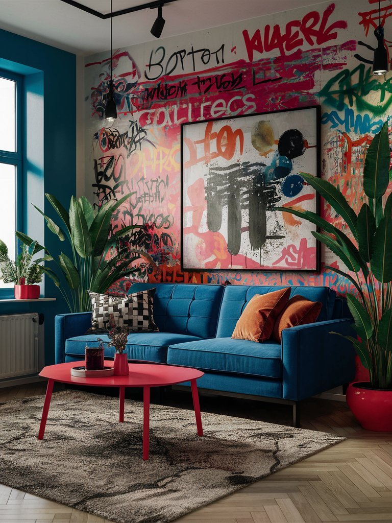 The graffiti-inspired feature wall is the centerpiece of this dopamine decor living room, bringing an urban and edgy vibe to the space. The vibrant mix of colors and textures on the wall immediately grabs attention, setting a playful and energetic tone. The overlay of bold text and abstract designs creates a sense of movement, adding depth and personality to the room. This wall acts as both art and a design element, reflecting creativity and rebellion. Its contrast with the smoother, more structured furniture creates a balanced yet dynamic aesthetic.