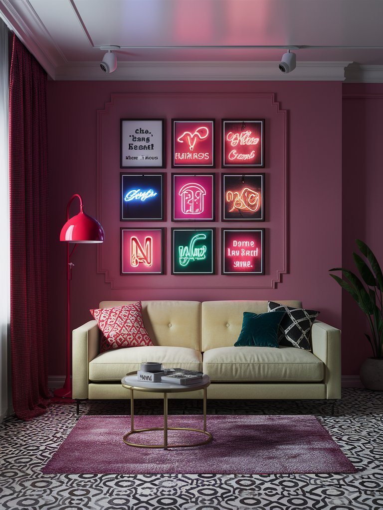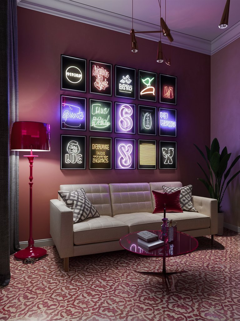 In addition to the neon wall art, the lighting choices in this room are both functional and decorative. The deep red floor lamp adds a pop of color while providing ambient lighting. Its glossy finish reflects the neon lights, amplifying their vibrant glow throughout the space. Overhead, a series of copper-toned pendant lights provide a warm and subtle contrast to the cooler tones of the neon lights. This multi-layered lighting approach ensures that the room feels both lively and cozy.