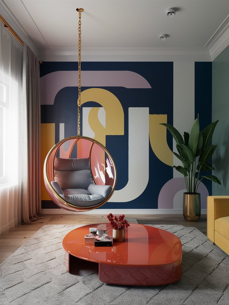 The hanging chair, with its sleek metallic finish and plush gray cushioning, is a playful yet luxurious addition to the room. Suspended by a gold chain, it not only provides seating but also acts as a sculptural element that enhances the room’s visual appeal. The reflective surface of the chair creates a dynamic interaction with the light and surrounding colors, adding an element of depth and movement. Its placement near the geometric wall ensures that it stands out without overpowering the design. This unique piece highlights the dopamine decor philosophy of blending fun and functionality seamlessly.