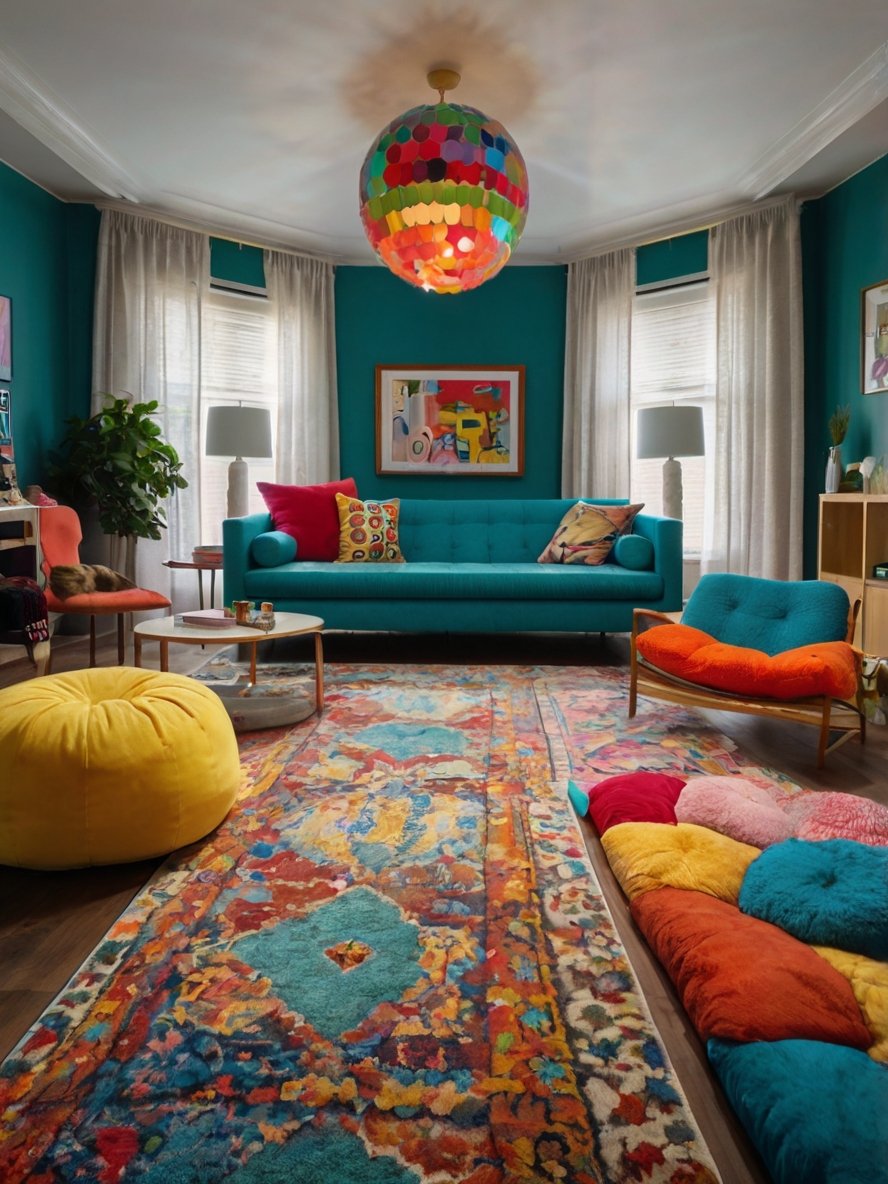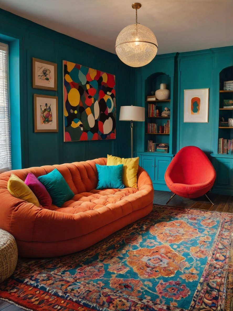 Despite its bold colors and patterns, the room achieves a sense of balance through its layout and design choices. The warm tones of the sofa and rug are tempered by the cool teal walls, creating a harmonious atmosphere. The rounded shapes of the furniture and decor elements further soften the space, ensuring it feels welcoming rather than overwhelming.