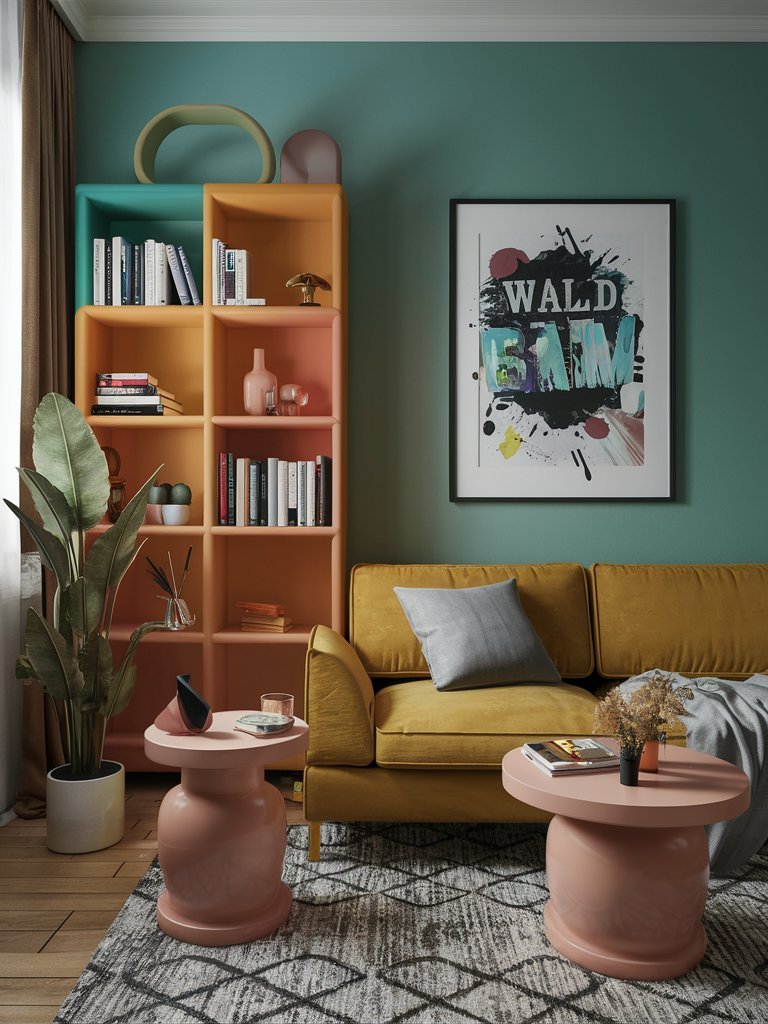 This open shelving unit is a standout feature, combining functionality with artistic expression. Painted in varying shades of coral and teal, the shelves provide a visual link to the room’s color palette. The unit is styled thoughtfully with books, vases, and decor items, adding depth and texture to the space. This design choice highlights the importance of balance—showcasing personality through curated displays without creating visual clutter.