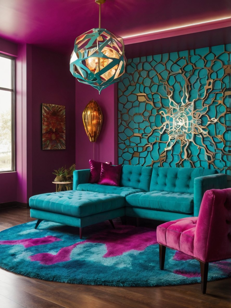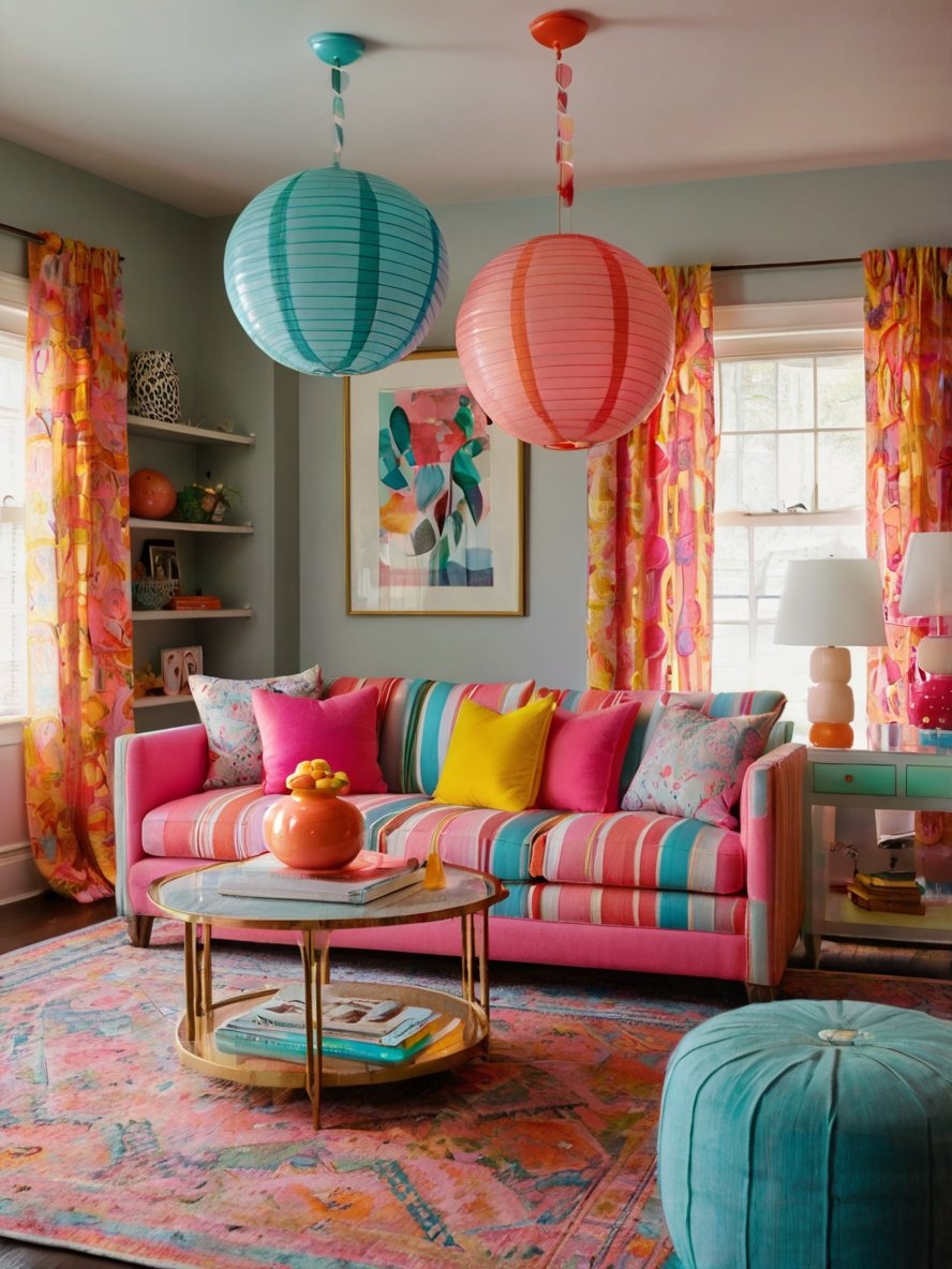 The hanging paper lanterns in vibrant pink and turquoise are a unique and whimsical addition to the space. Positioned centrally, they draw the eye upward, adding height and interest to the room. Their soft glow enhances the playful vibe while also serving as a functional lighting element. The lanterns’ lightweight, textured material contrasts with the more solid elements of the room, such as the furniture and tables, creating a sense of balance. This innovative ceiling decor demonstrates how lighting fixtures can double as statement pieces in dopamine-inspired interiors.