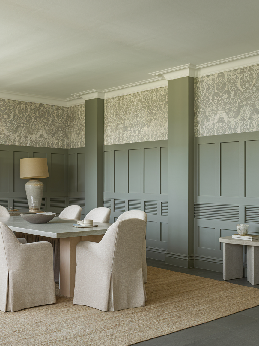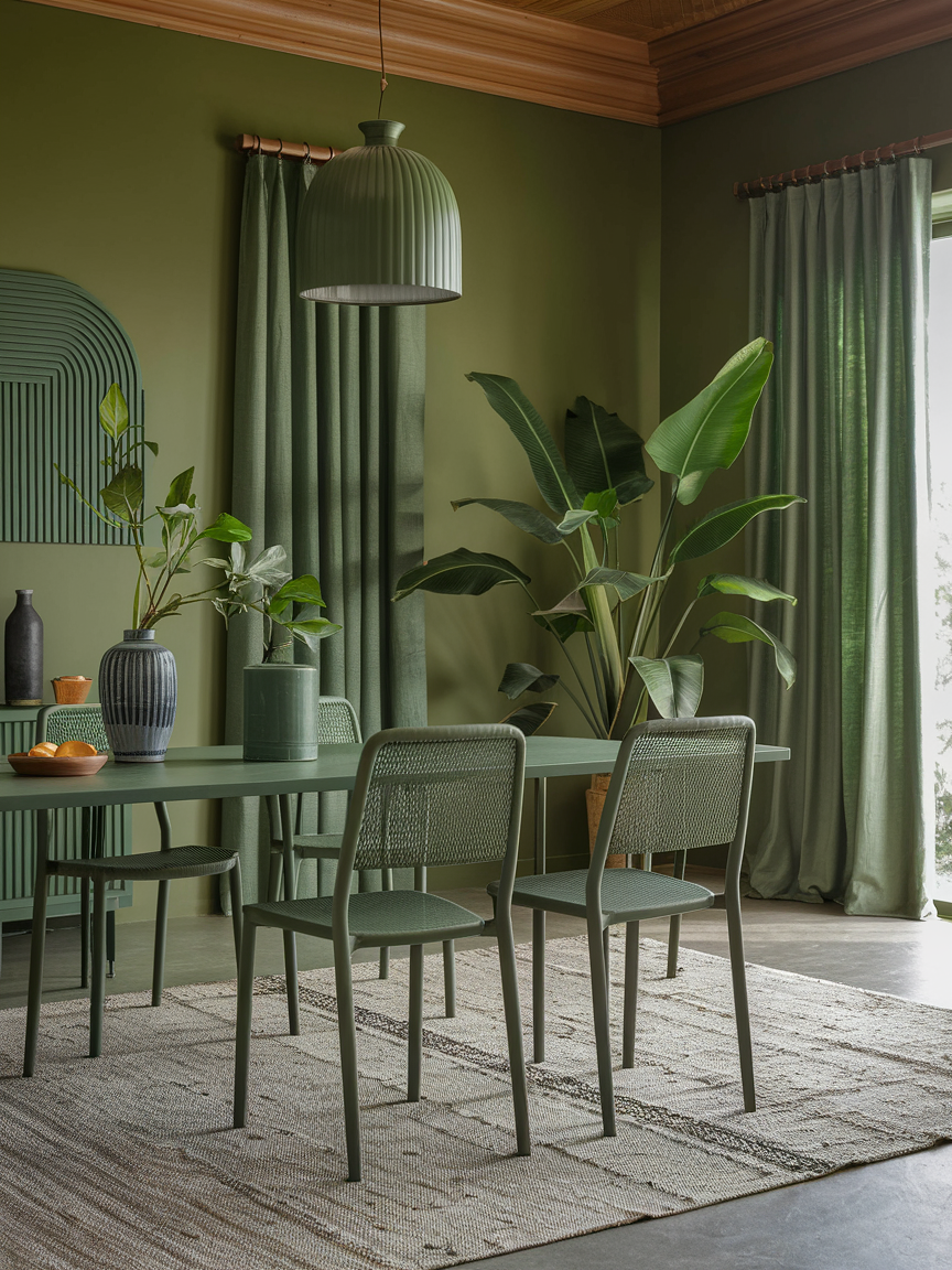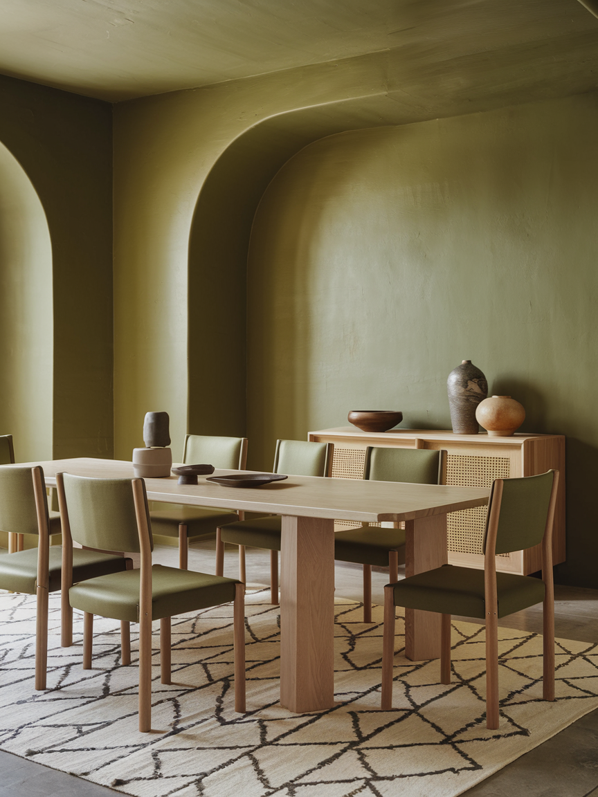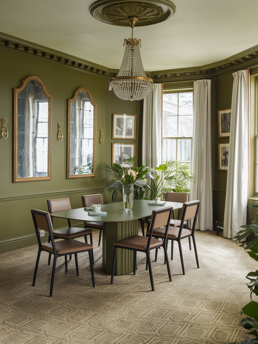 Olive green brings warmth and grounded sophistication to dining room interiors. Inspired by nature, this earthy tone pairs beautifully with natural wood finishes, stone textures, and neutral textiles. Olive green walls create a cozy yet polished backdrop that feels inviting rather than formal. This shade works especially well in transitional and Mediterranean-inspired homes. Layering olive green with cream accents, woven rugs, and ceramic décor enhances its organic charm. The result is a dining room that feels relaxed, stylish, and ideal for everyday meals as well as special occasions.