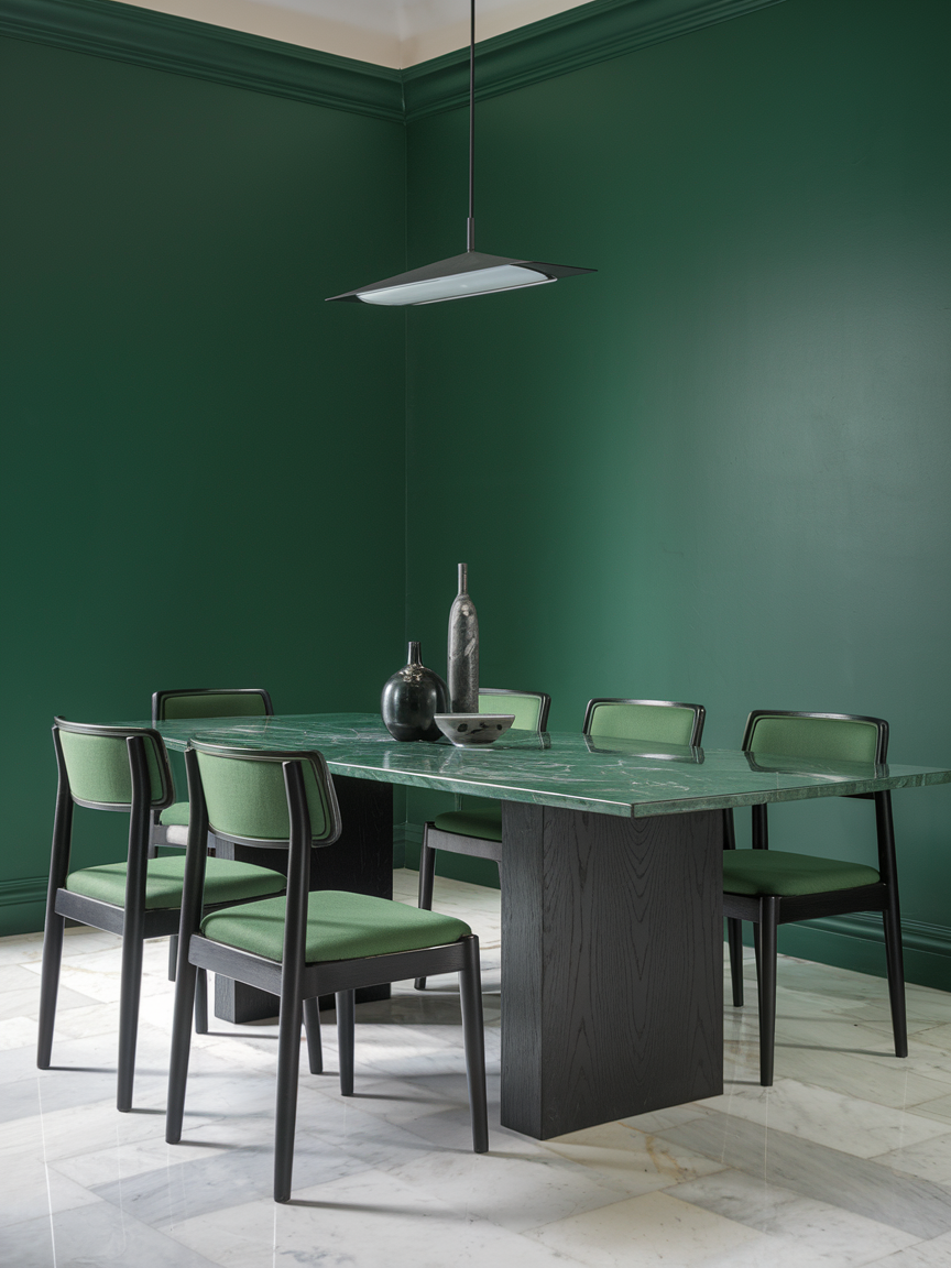 Green and black create a bold yet refined dining room palette. Black furniture or accents ground the space, while green adds warmth and life. This combination works particularly well in modern and contemporary interiors. Matte black finishes paired with deep green walls create contrast without harshness. Proper lighting ensures the space remains inviting rather than stark. The result is a sleek, sophisticated dining room with strong visual impact.