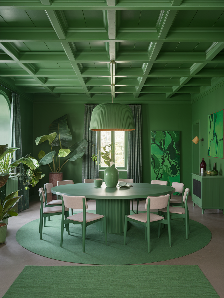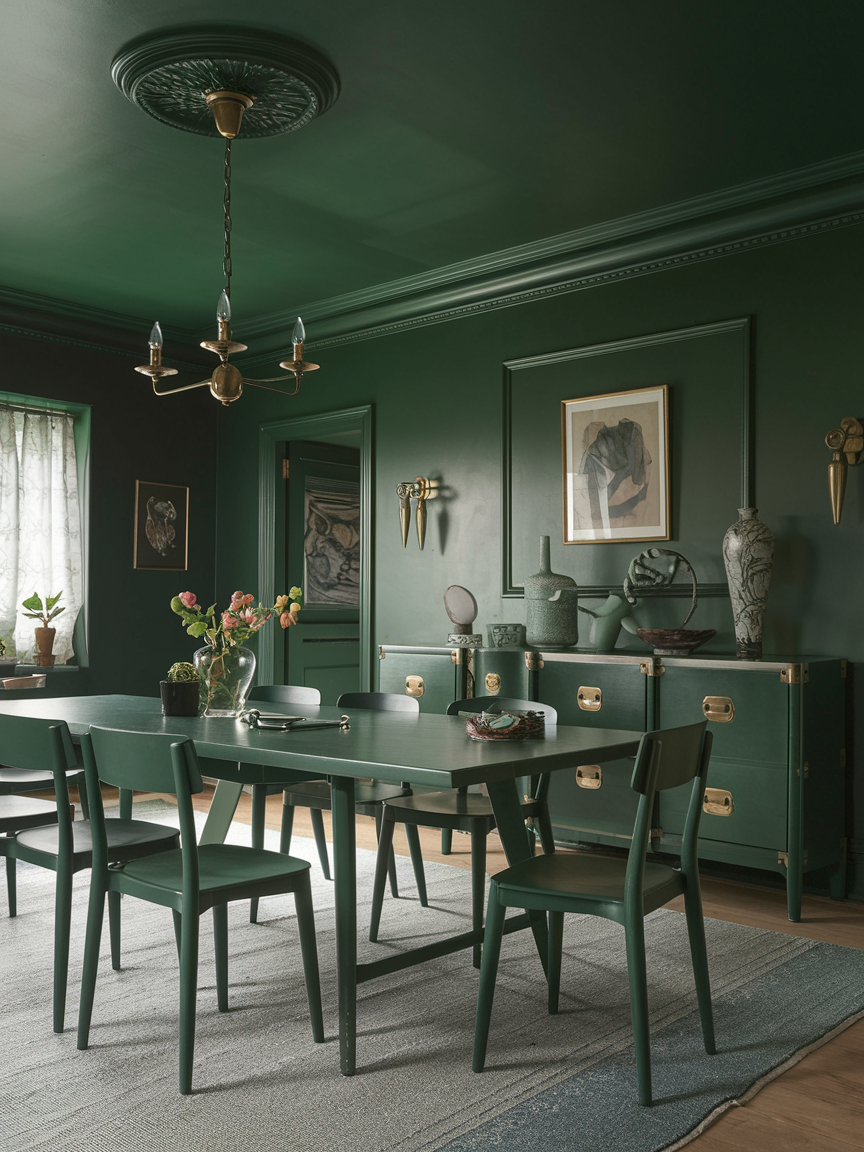 A dark green ceiling introduces drama and intimacy, transforming the dining room into a sophisticated and memorable space. This unexpected design element draws the eye upward, adding visual interest without overwhelming the room. Dark green ceilings work particularly well in dining areas because they create a cocooning effect that feels warm and atmospheric. When paired with lighter walls, reflective surfaces, and warm lighting, the space remains balanced and inviting. Chandeliers or pendant lights stand out beautifully against the darker backdrop, enhancing the overall elegance. This bold yet tasteful approach adds depth and personality while maintaining a refined dining room aesthetic.