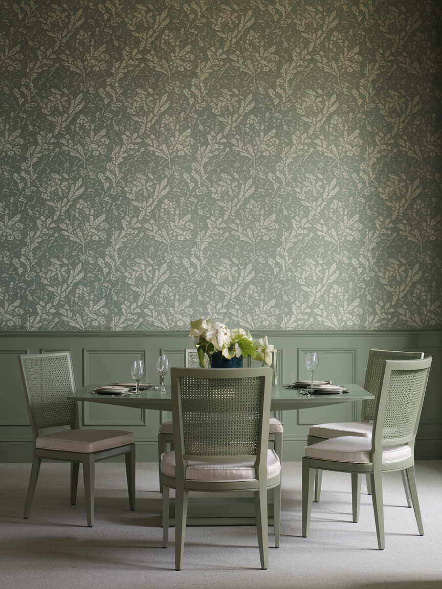 Green wallpaper introduces pattern and texture while maintaining elegance. Subtle florals, geometrics, or textured designs add visual interest without overwhelming the space. Wallpaper works particularly well as an accent wall or in formal dining rooms. Pair patterned walls with simple furniture to maintain balance. Green wallpaper creates a curated, designer-inspired look that elevates the dining experience.