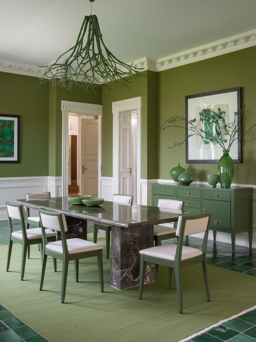 Marble accents add luxury and refinement to green dining rooms. Marble tabletops, sideboards, or decorative accessories introduce contrast and elegance. The light veining of marble balances green tones, keeping the space bright and polished. This pairing feels timeless and sophisticated, ideal for upscale dining spaces.