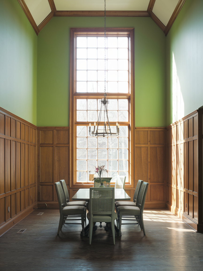 Wood paneling adds depth, texture, and architectural interest to green dining rooms, creating a layered and visually rich environment. When painted in soft or deep green tones, paneling feels both classic and elegant, evoking traditional craftsmanship with a modern twist. This design choice pairs beautifully with wooden dining furniture, vintage-inspired lighting, or decorative molding. Wood paneling also adds warmth, preventing green walls from feeling flat or cold. Whether applied halfway up the wall or floor to ceiling, paneling enhances character while maintaining a cohesive color palette. The result is a dining room that feels timeless, grounded, and thoughtfully curated.