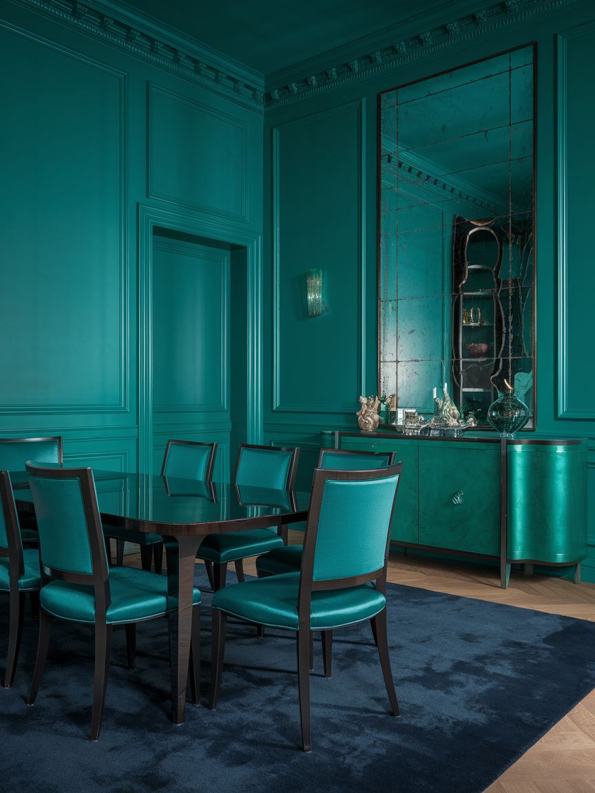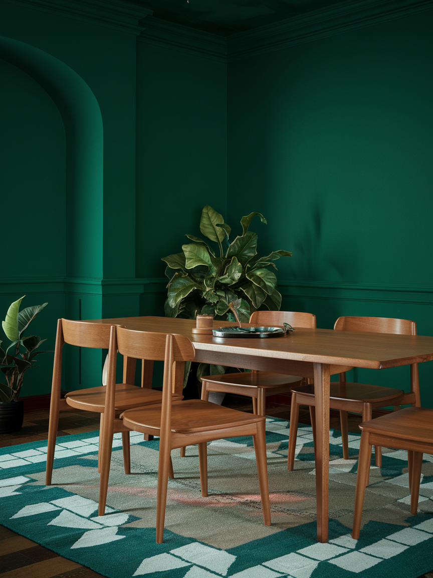Emerald green adds richness and drama to dining rooms while maintaining an elegant tone. This jewel-inspired shade works exceptionally well in formal dining spaces, creating a refined and luxurious ambiance. Emerald walls or statement furniture pieces provide depth and visual interest, especially when paired with warm metallic accents like brass or gold. Crystal lighting fixtures, velvet dining chairs, or marble surfaces enhance the opulent feel. Proper lighting is essential to balance the intensity of the color and maintain warmth. Emerald green transforms the dining room into a statement space ideal for hosting elegant dinners and celebratory gatherings with timeless appeal.