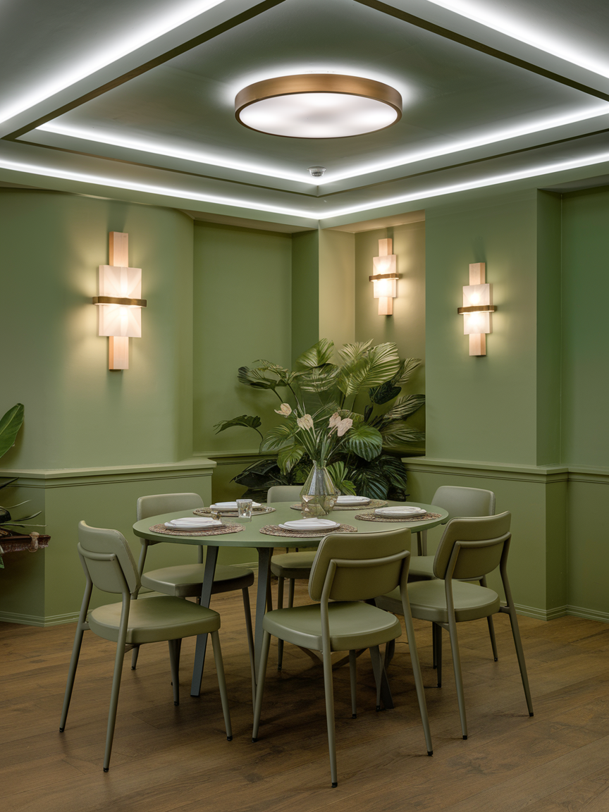 Layered lighting is essential for enhancing green dining rooms and creating a warm, adaptable atmosphere. By combining overhead fixtures, wall sconces, and ambient lighting, the space gains depth and flexibility. Overhead chandeliers provide structure, while softer accent lighting highlights textures and architectural details. Warm-toned bulbs are particularly effective, bringing out the richness of green hues and making the room feel inviting. Layered lighting allows the dining room to transition seamlessly from bright daytime meals to intimate evening gatherings. This thoughtful approach ensures the space feels comfortable, functional, and elegantly styled at all times.