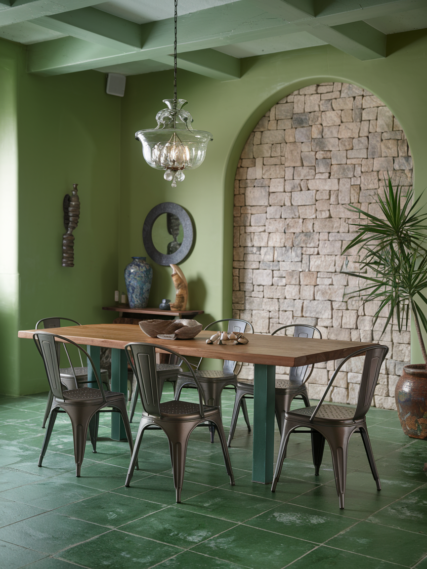 Mixing materials such as wood, metal, glass, and stone adds richness and sophistication to green dining rooms. This layered approach prevents the space from feeling one-dimensional and enhances visual depth. Green acts as a unifying color, allowing diverse materials to coexist harmoniously. For example, wooden tables, metal lighting, and stone accessories each contribute texture and contrast. The result is a dining room that feels thoughtfully designed, balanced, and timeless. Mixed materials bring character and individuality, making the space feel curated rather than overly styled.