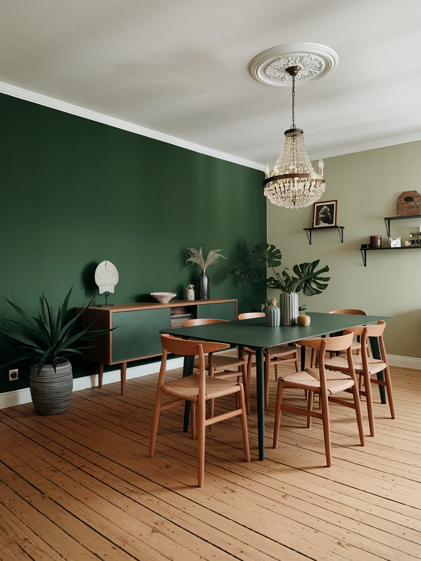 Green and natural wood are a timeless pairing that creates warmth and elegance. Wooden dining tables, chairs, or cabinetry soften green walls and add texture to the space. Light woods enhance airy green tones, while darker woods complement deeper shades like emerald or hunter green. This combination feels grounded and organic, making the dining room welcoming and stylish. Natural wood elements also add durability and timeless appeal, ensuring the space remains beautiful for years to come.