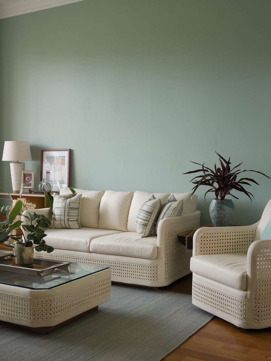 Seafoam green has that magical quality of feeling fresh yet calming. It brings to mind soft ocean waves and breezy afternoons, making it perfect for a laid-back living room. Pair it with sandy beige, crisp white, and woven textures to create a light and airy coastal vibe. This shade is especially good at making a space feel rejuvenating and open, so it is great for smaller rooms or spaces that don’t get a ton of natural light.