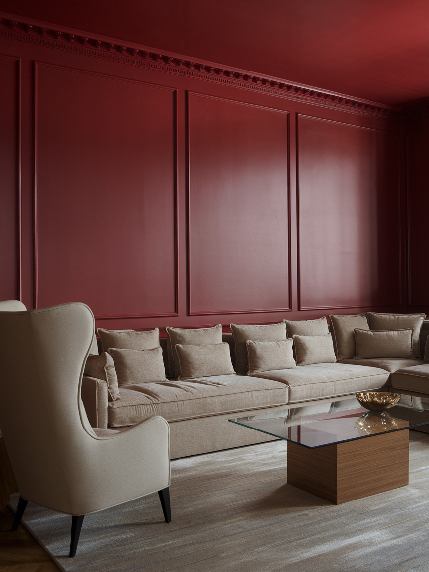 Ruby red is unapologetically bold, rich, and confident. It instantly commands attention and sets a glamorous mood. This color works best when used strategically—maybe as an accent wall paired with cream or gold details, or through plush velvet furniture that becomes the room’s centerpiece. Red is known for sparking conversation and energy, so it is an excellent choice for entertaining spaces. Just make sure to balance it with softer tones to keep the room from feeling overwhelming.