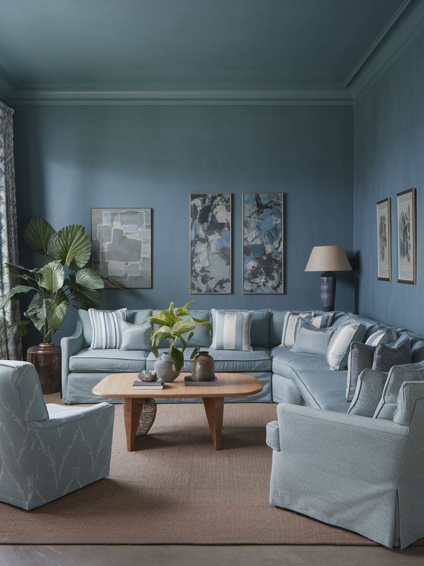 Sky blue is like a gentle exhale for your living room. It’s light, airy, and makes you feel like you are on a coastal holiday without leaving your sofa. This shade works beautifully with white trim, natural fibers, and pale wood furniture. Add some striped cushions or a jute rug for that relaxed beach-house vibe. It’s also a fantastic choice if you want to visually open up a smaller space because it reflects light and creates an uplifting atmosphere that’s calm but never dull.
