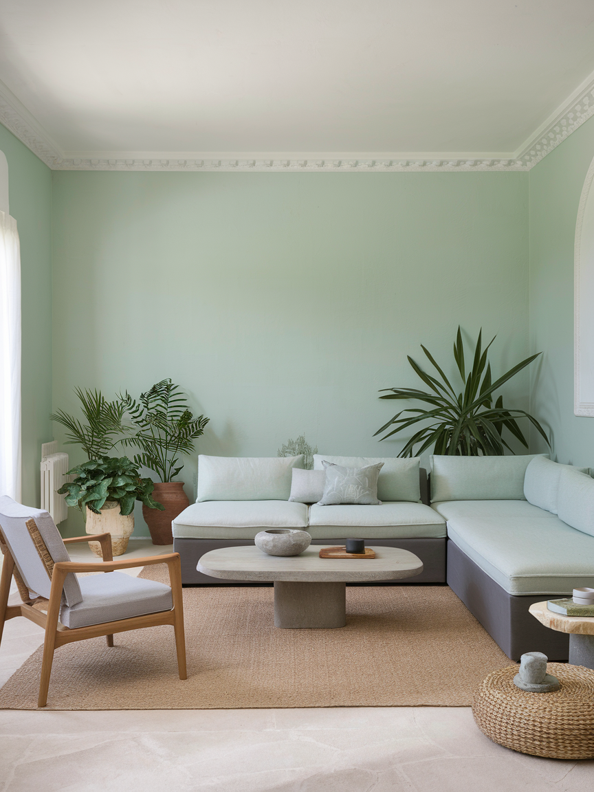 Soft mint is refreshing, cheerful, and perfect for making your living room feel a little more open. It pairs wonderfully with white trim, light woods, and natural fibers, creating a breezy, relaxed vibe. This shade works especially well in spaces that need a little pick-me-up, as it reflects light and feels uplifting. It is subtle enough to keep the atmosphere calm but still brings in a pop of personality that makes the room feel thoughtfully designed.