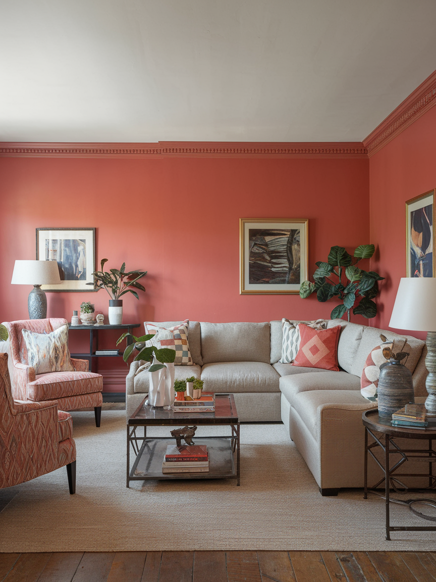 Coral brings a fun, playful energy into the living room while still feeling chic. It’s warm, vibrant, and instantly brightens the mood of the space. Pair it with crisp white for a fresh look or with navy for a more nautical vibe. Coral works beautifully in rooms that get plenty of light, as it enhances that natural brightness. It’s also a fantastic way to make your living room feel more welcoming for guests without going too over the top.