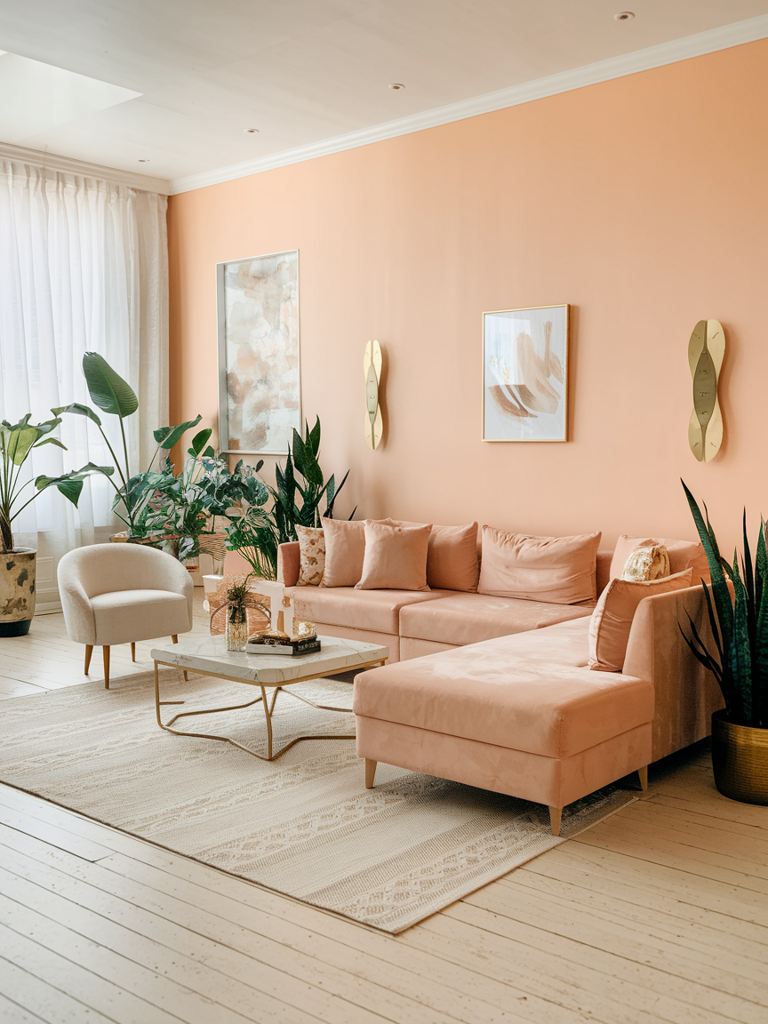 Pale peach is gentle, uplifting, and just a little unexpected. It’s a lovely choice if you want something warmer than white but softer than pink. This color works especially well in sunny living rooms, where the natural light makes it glow. Pair it with light wood, cream, and a few gold accents for a soft, dreamy atmosphere. It is perfect for creating a living room that feels bright and welcoming without being too intense.