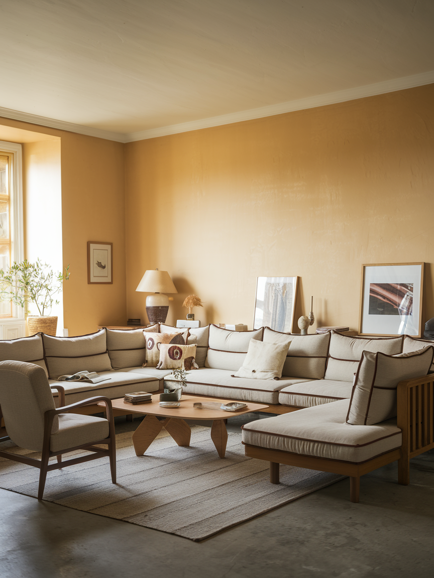 Golden beige is basically sunshine in paint form. It has that natural warmth that makes any living room feel more inviting. It’s neutral enough to work with various styles but has enough golden undertones to add personality. This shade pairs wonderfully with natural materials like rattan, linen, and oak. You can lean into the earthy vibe with terracotta accents or keep it light and breezy with white and cream furnishings. Either way, it is a color that instantly uplifts the mood.