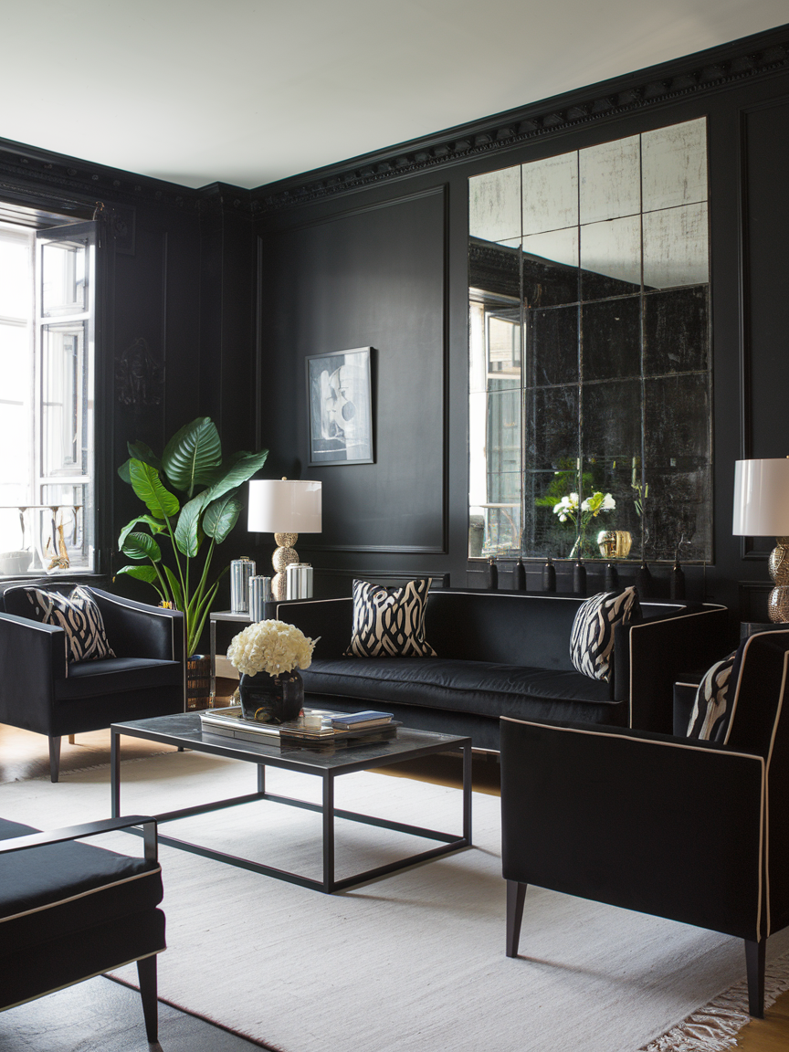 Black might sound risky for a living room, but it can be stunning when done right. It adds depth, drama, and a high-end feel that is hard to match. The trick is to balance it with plenty of light elements—white trim, large mirrors, or light-colored furniture. Black walls can make artwork and décor pop like nothing else. If you want your living room to feel bold, modern, and effortlessly cool, black could be your perfect match.