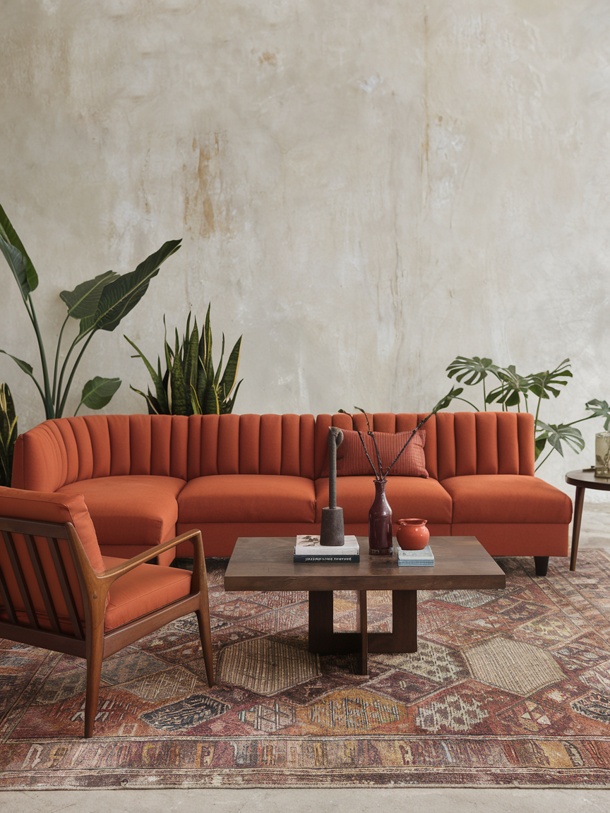 If you want your living room to have energy and personality, burnt orange is your go-to. It’s warm, vibrant, and instantly draws attention without feeling chaotic. This color works especially well in bohemian, retro, or eclectic spaces. Pair it with natural wood, patterned textiles, and plenty of greenery for a balanced look. It’s the perfect mood-lifter for days when the weather (or your mood) is a little gloomy.