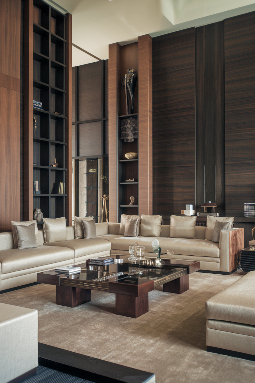 Wood brings warmth and depth to a room, especially when it’s in a rich tone like walnut or mahogany. Incorporate it through coffee tables, shelving, or even a stunning wood-paneled accent wall. The texture and natural grain make the space feel grounded and expensive. Pair it with soft fabrics and metallic details to balance the look, so it’s neither too rustic nor too modern.