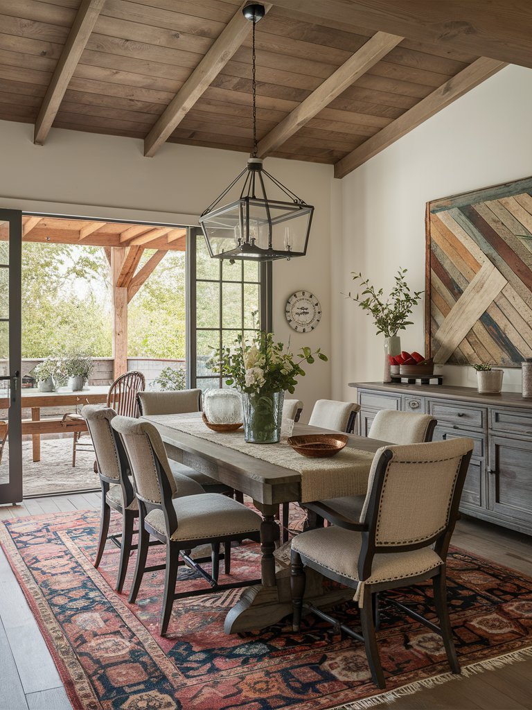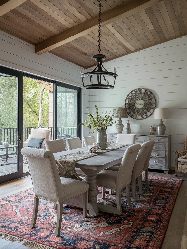 The large vintage rug beneath the dining table introduces a beautiful contrast to the otherwise neutral palette. The rich red, navy, and beige tones add warmth and visual interest, grounding the space with a touch of old-world charm. The intricate patterns provide a sense of history and character, reinforcing the farmhouse theme while adding an unexpected yet sophisticated element. This rug also helps define the dining area, making it feel cozy and intentional.