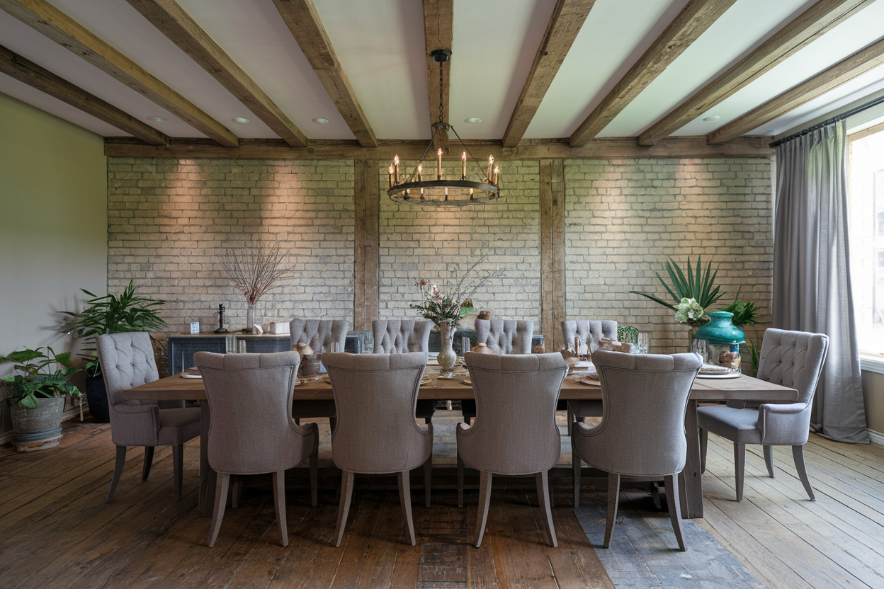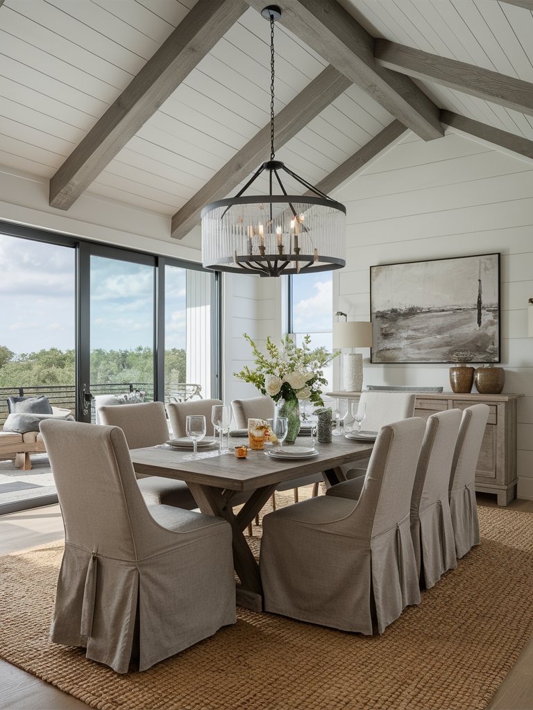 The vaulted ceiling with exposed gray-washed beams adds grandeur to the space, creating an airy, open feel. The contrast between the white shiplap ceiling and the rustic beams enhances depth, making the architectural details stand out beautifully. These beams bring a sense of history and craftsmanship, reinforcing the farmhouse aesthetic while maintaining a modern sensibility. Their natural wood finish ties in with the table and sideboard, ensuring cohesion throughout the space.