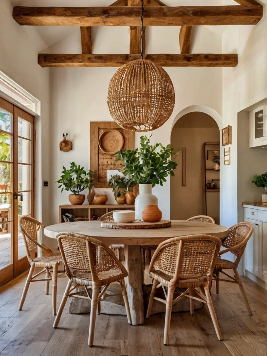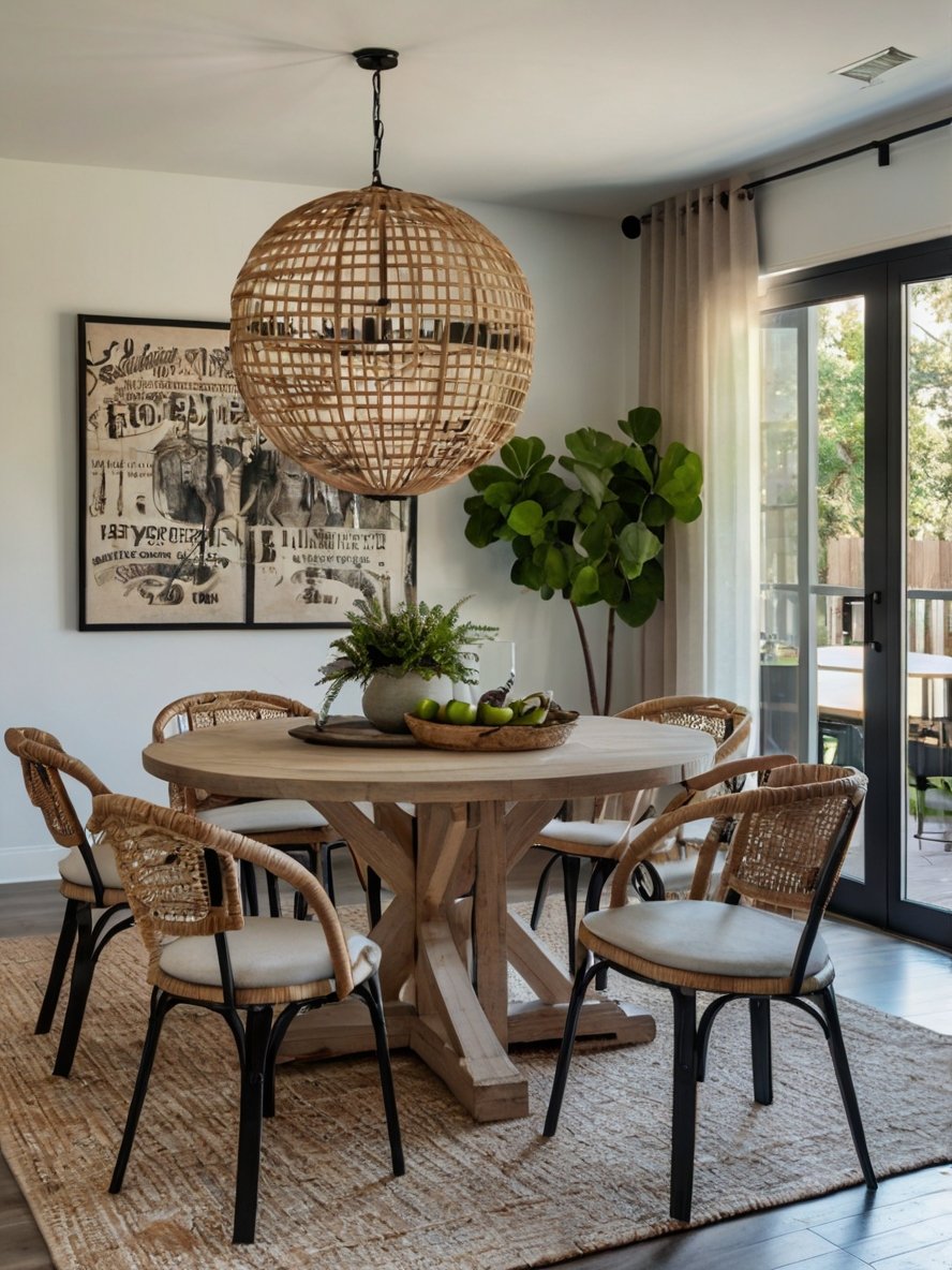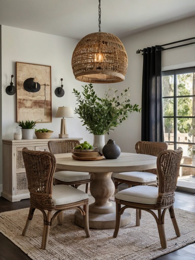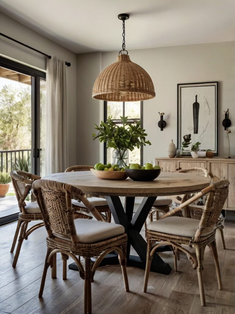 The large woven pendant light hanging above the table is a stunning focal point that enhances the room’s organic and artisanal appeal. Its globe shape and intricate weaving allow for soft, diffused lighting, creating a warm and inviting atmosphere. The woven texture echoes the material of the dining chairs, ensuring design continuity. The pendant’s size ensures that it commands attention without overwhelming the space, providing both practical illumination and decorative impact.