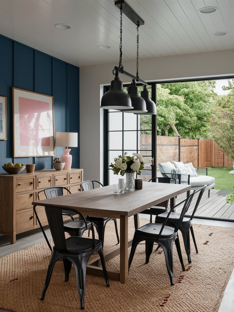 This modern farmhouse dining room makes a bold statement with its deep navy blue accent wall, providing a rich contrast to the neutral elements in the space. The color adds depth and personality while maintaining a sophisticated and cozy atmosphere. The white ceiling and light-colored walls prevent the room from feeling too dark, ensuring a bright and airy ambiance. The contrast between the navy blue, warm wood tones, and black industrial accents creates a dynamic and visually engaging space that feels both modern and rustic.