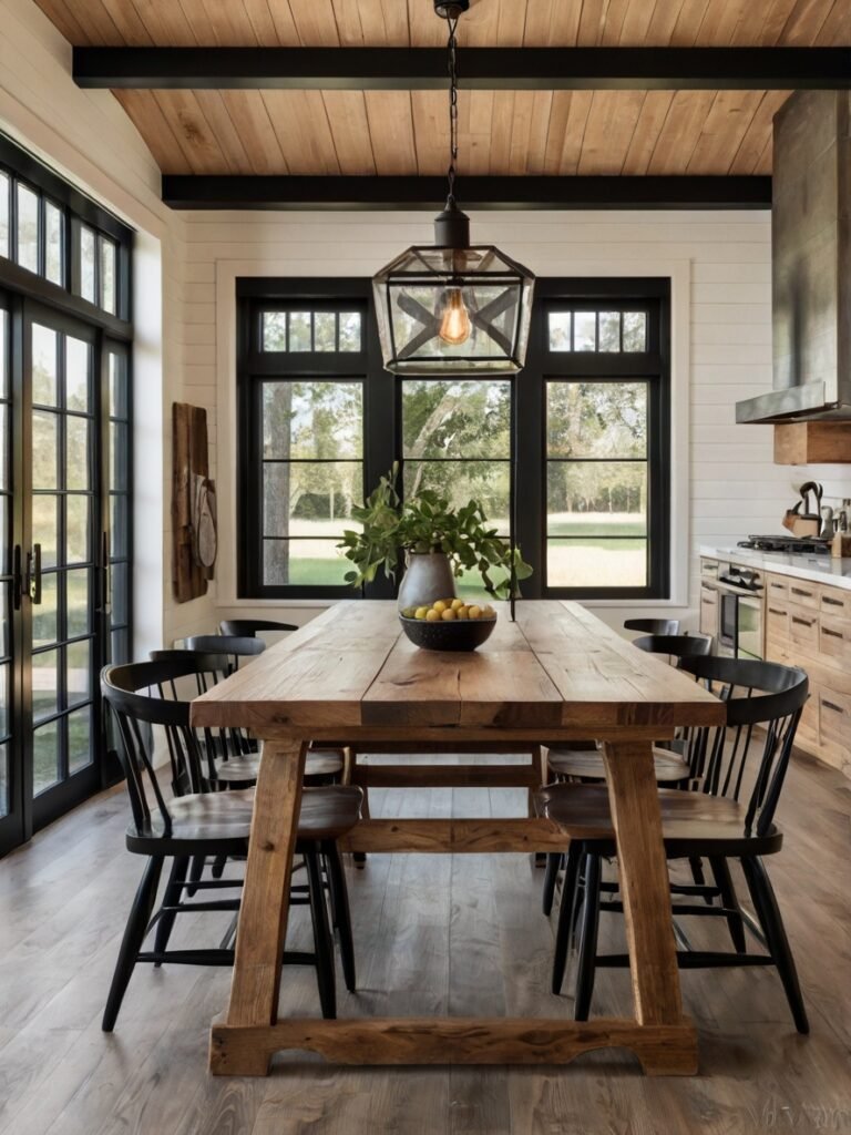 The geometric lantern pendant light above the table adds a refined industrial touch, blending farmhouse charm with modern elegance. The open-frame design ensures unobstructed light flow, while the black metal finish echoes the dark window frames and chairs. The exposed Edison-style bulb adds warmth, reinforcing the rustic ambiance. This statement fixture helps define the dining space, drawing the eye upward and enhancing the room’s overall character.