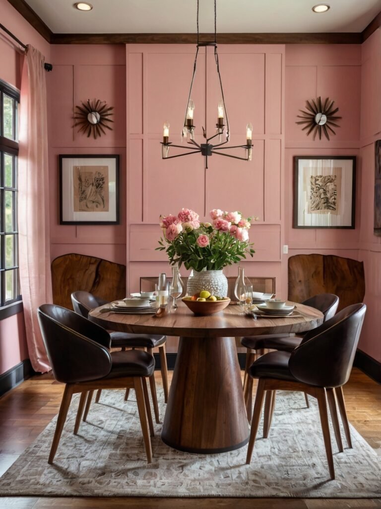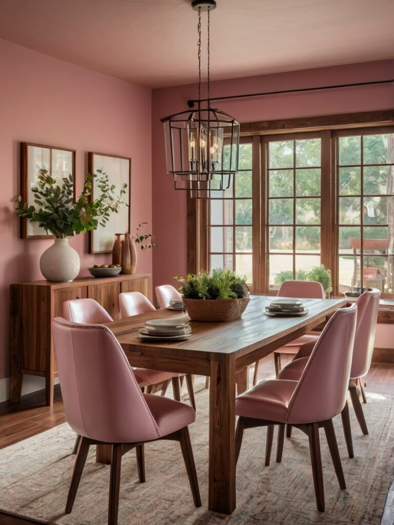 Unlike traditional modern farmhouse dining rooms that rely on neutral tones, this space embraces a bold yet sophisticated pink hue. The soft, muted shade of pink on the walls creates a warm and inviting atmosphere while maintaining a sense of modern elegance. Paired with natural wood elements, the pink adds a refreshing contrast that makes the room feel both cozy and stylish. The warmth of the color enhances the farmhouse aesthetic while offering a unique, contemporary twist. This approach demonstrates how modern farmhouse design can be versatile, incorporating unexpected colors while still maintaining its signature comfort and charm.
