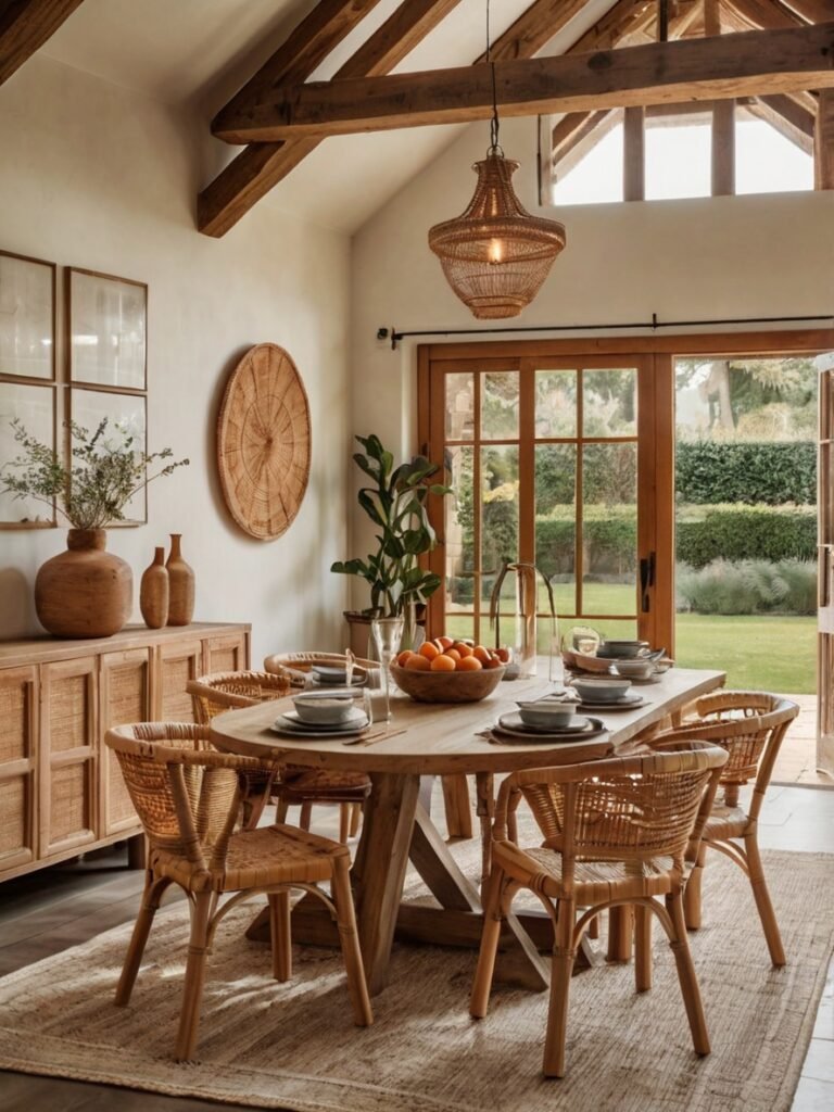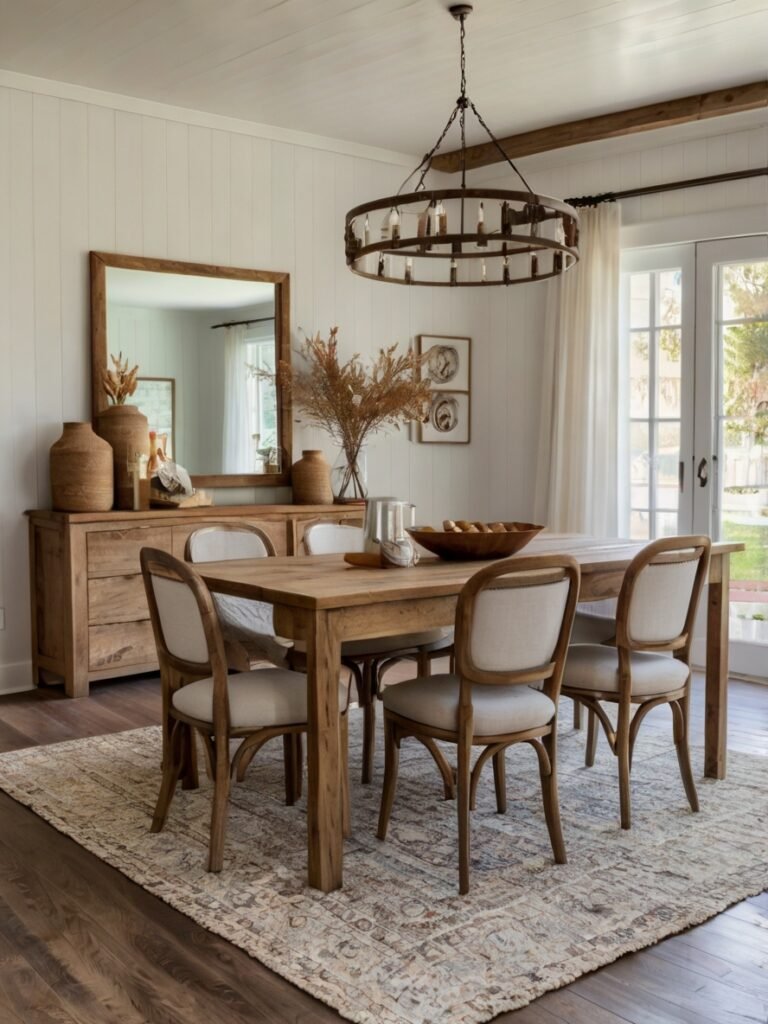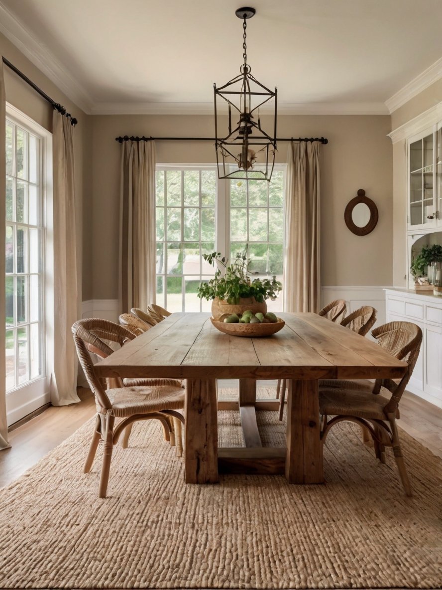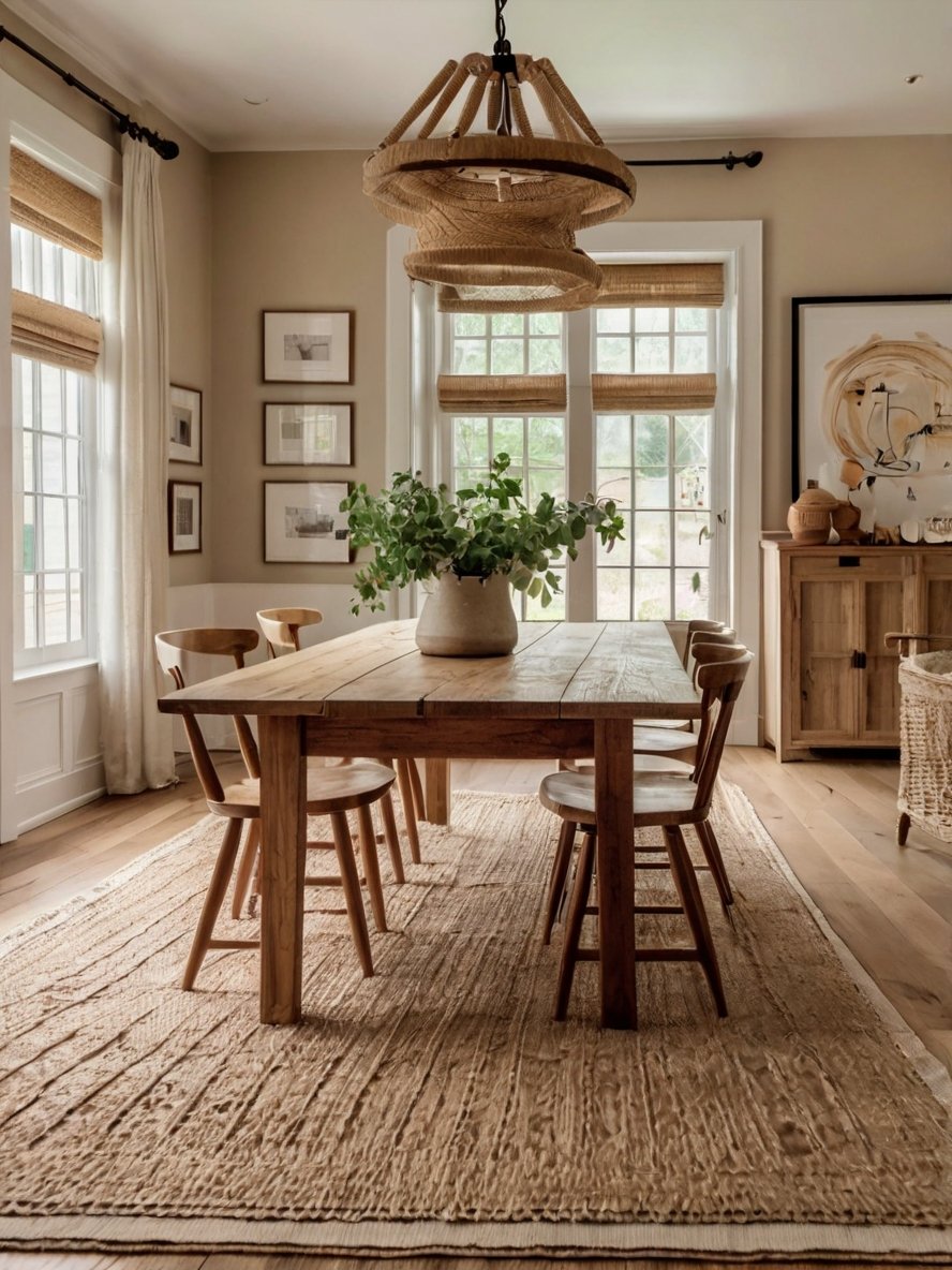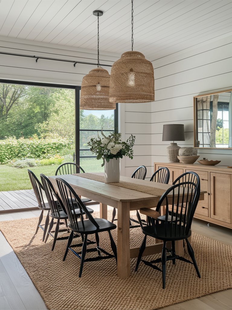 A defining characteristic of this dining room is its excellent use of natural materials. The wooden dining table, sideboard, and woven pendant lights all bring in organic textures that reinforce the farmhouse charm. The jute area rug adds another layer of texture, grounding the space while enhancing warmth. The combination of raw wood, woven fibers, and soft textiles creates a tactile experience that makes the room feel cozy yet sophisticated. These natural elements not only add aesthetic appeal but also contribute to a sustainable and eco-friendly design approach, making the space feel authentic and harmonious with nature.