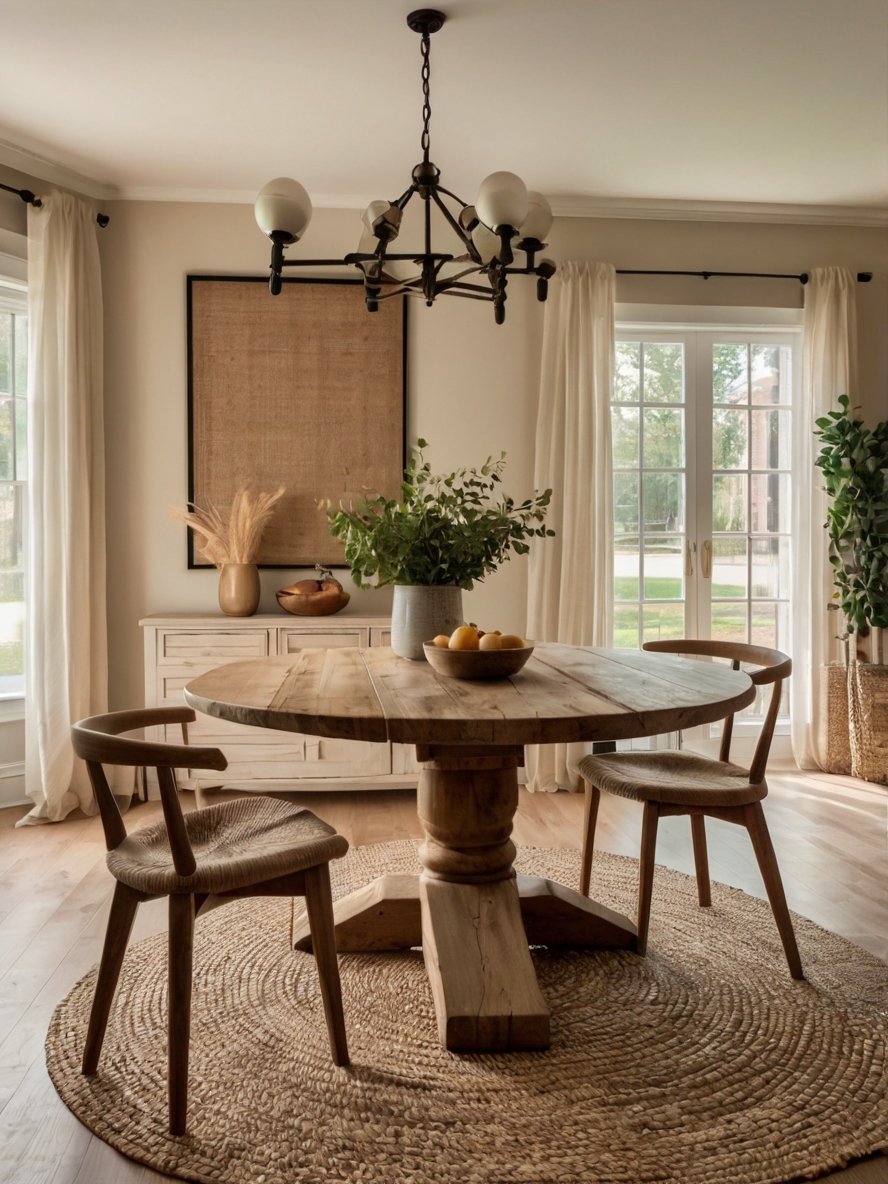 The round pedestal dining table is the centerpiece of this space, offering a perfect blend of elegance and rustic charm. The natural wood finish highlights the grain, adding texture and warmth. The pedestal base introduces a classic farmhouse touch while maintaining a contemporary silhouette that complements the surrounding furniture. A round table encourages conversation, making this an excellent choice for intimate gatherings. The simplicity of the table allows the woven dining chairs and decorative accents to take center stage while still holding their own as a statement piece.