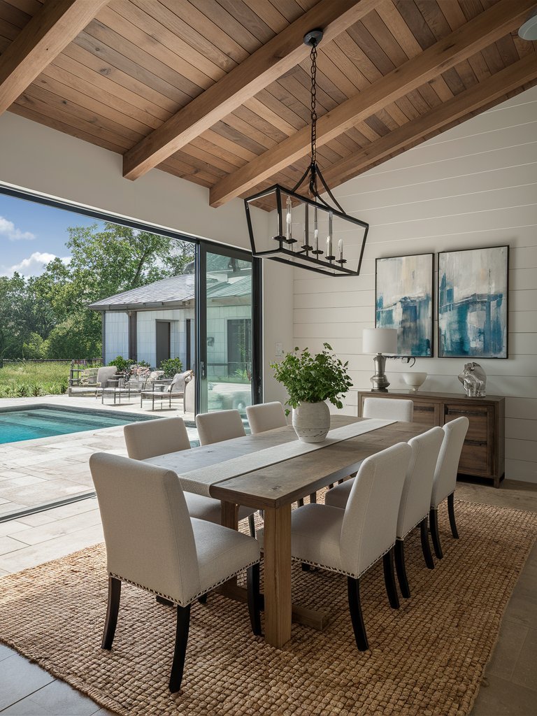 This dining room seamlessly integrates indoor and outdoor living, thanks to the expansive floor-to-ceiling glass sliding doors. The open design allows natural light to flood the space, enhancing its brightness and making it feel expansive. The poolside view and lush greenery add a refreshing touch, reinforcing the connection to nature. The black window frames provide a modern contrast against the white shiplap walls, ensuring the space feels both sleek and inviting.