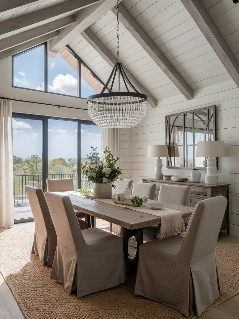 The choice of slip-covered dining chairs adds an extra layer of comfort and refinement. Their soft, upholstered fabric enhances the room’s inviting ambiance, making dining feel more relaxed and luxurious. The neutral linen fabric blends seamlessly with the rest of the space, reinforcing the cohesive color scheme. The skirted design introduces a touch of elegance while maintaining a casual, homey feel. These chairs are not only aesthetically pleasing but also practical, as slipcovers can be easily removed for cleaning, making them ideal for everyday use in a farmhouse-style home.