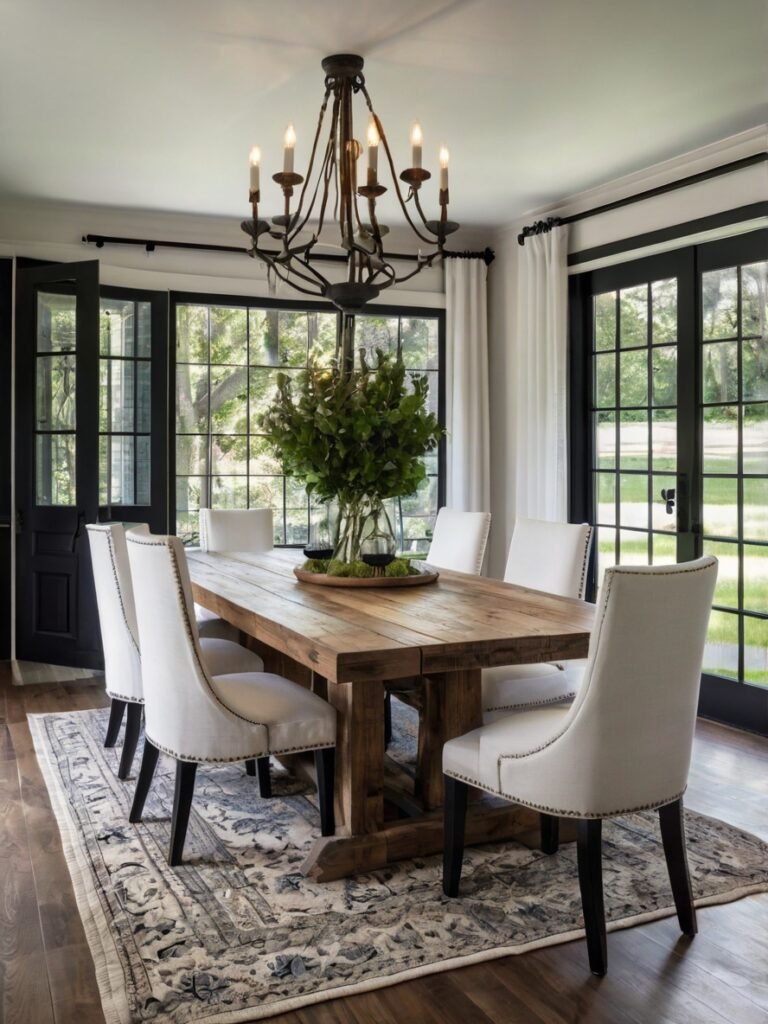 This dining room masterfully balances light and dark tones to create a sophisticated and striking aesthetic. The contrast between the white upholstered dining chairs and the black window frames, curtain rods, and chandelier enhances the visual depth of the space. The combination of dark wood flooring with a lighter area rug further contributes to this dynamic interplay, preventing the room from feeling too monochromatic. This balance between bold black elements and soft neutrals exemplifies a refined modern farmhouse style that feels both dramatic and inviting.