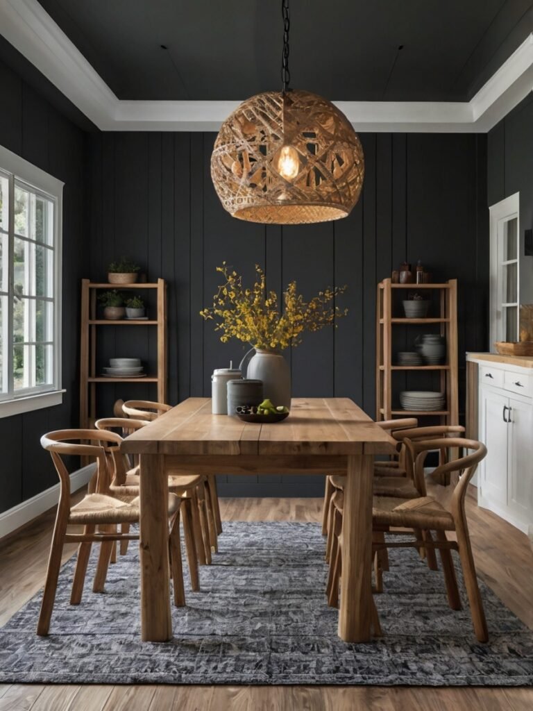 This dining room takes a daring approach to modern farmhouse aesthetics by using deep charcoal black walls & ceiling, creating a bold and sophisticated ambiance. The dark tones provide an elegant contrast to the natural wood furniture and woven textures, making every element stand out. The white trim and ceiling provide balance, preventing the space from feeling too heavy. This color choice makes the room feel modern, moody, and refined, showcasing how farmhouse design can embrace darker hues while maintaining warmth and approachability.