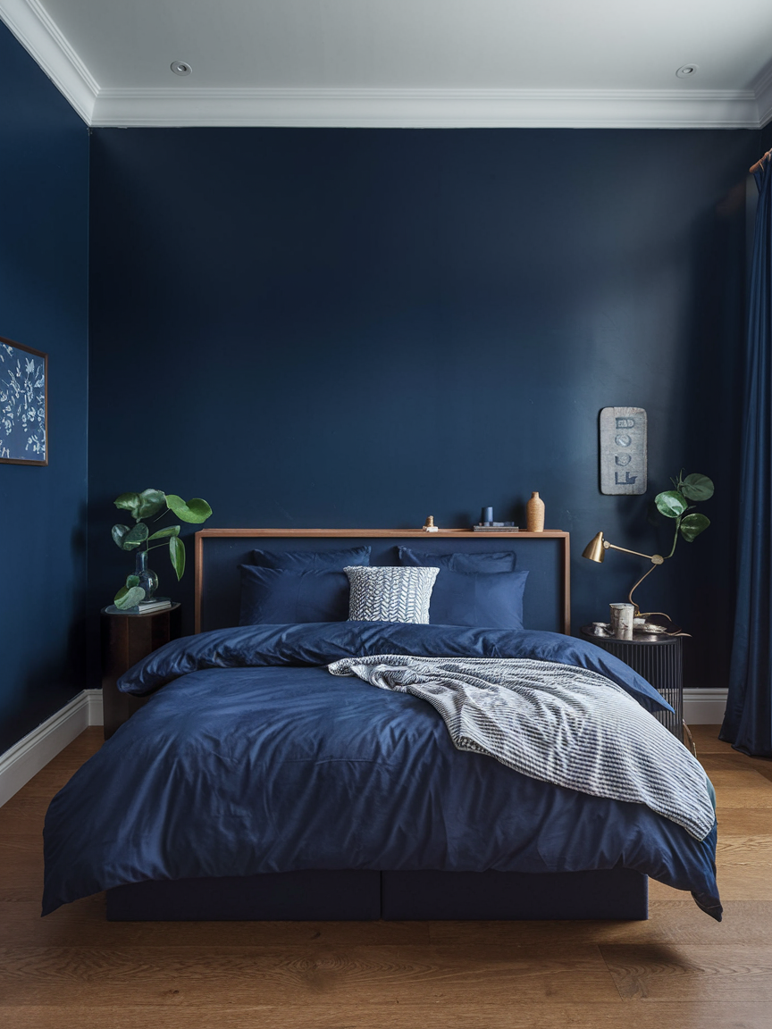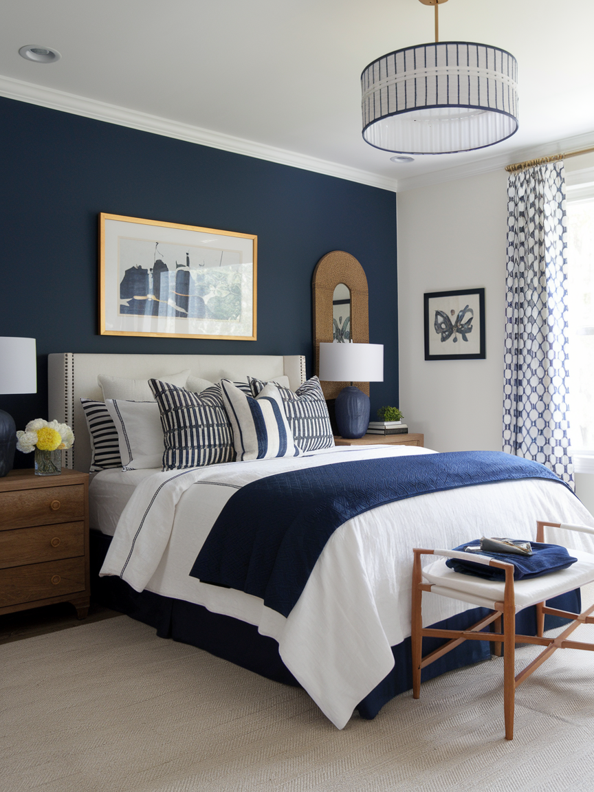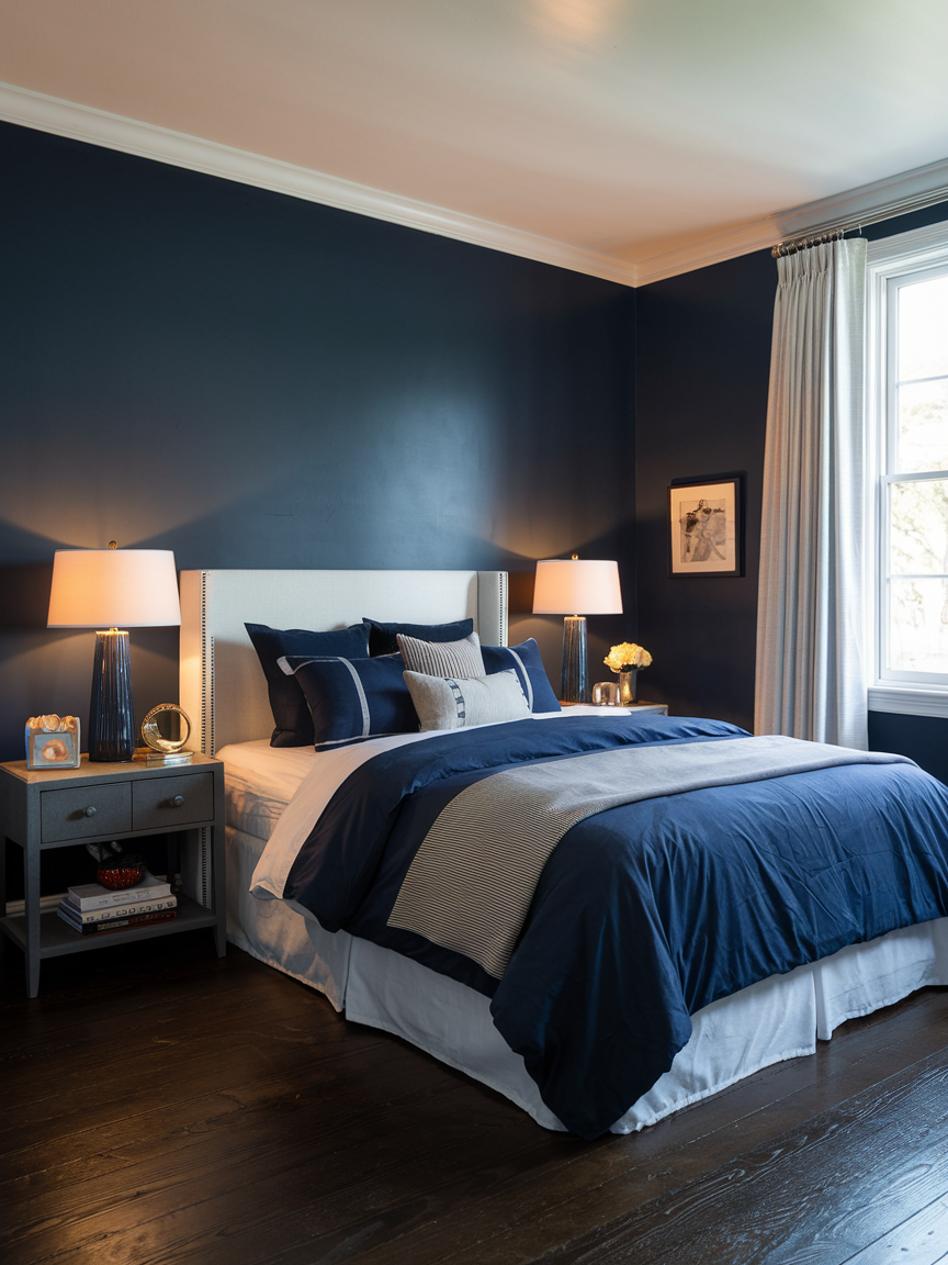 A navy accent wall is one of the most impactful ways to introduce this rich color into a bedroom without overwhelming the space. Positioned behind the bed, it creates a strong focal point while grounding the room visually. Navy’s depth adds instant sophistication, making even simple furnishings feel intentional and refined. When paired with lighter walls, the contrast enhances brightness and balance. Soft bedding, natural wood furniture, and warm lighting help soften the boldness of the navy, ensuring the room remains restful rather than dramatic. This approach is perfect for those who want a chic statement while maintaining a calming, sleep-friendly atmosphere.