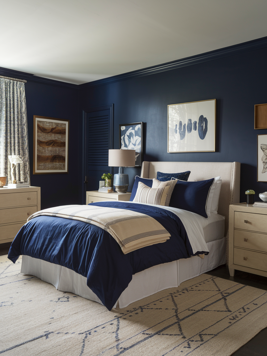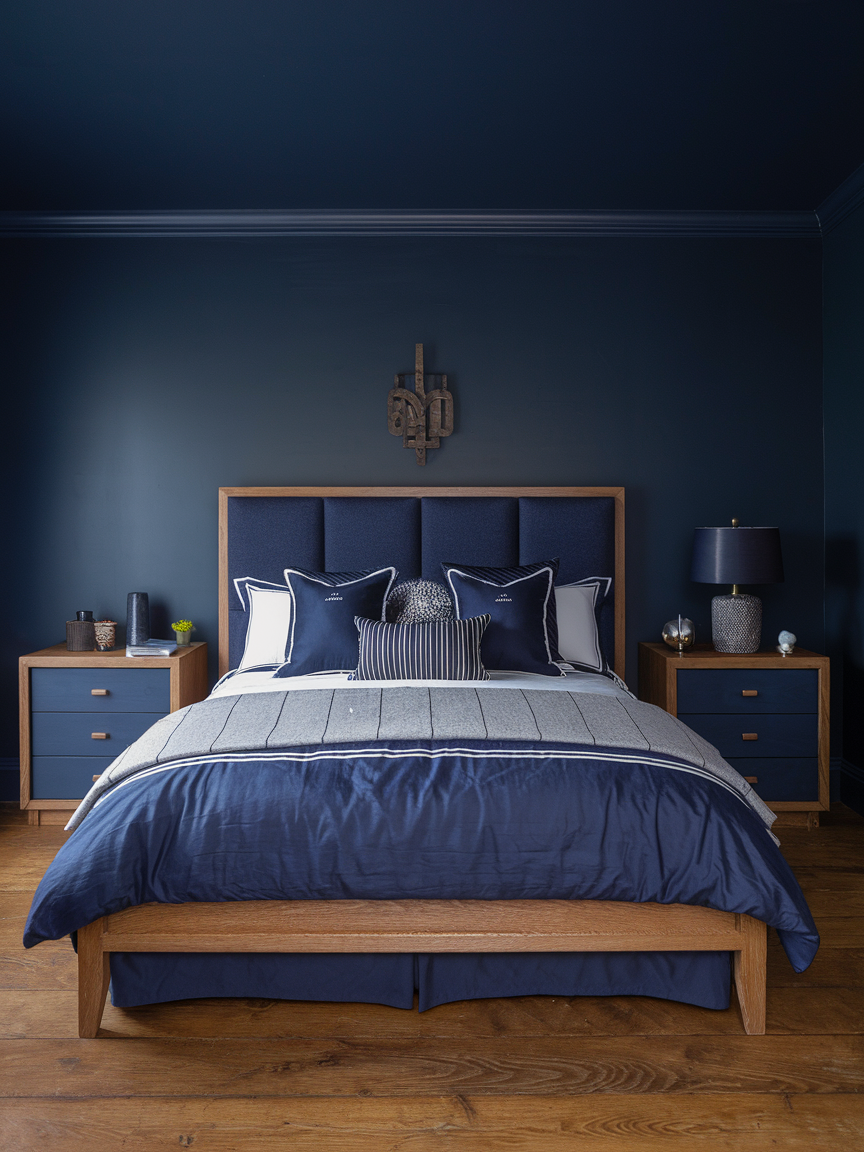 3. Navy Bedroom with Warm Wood Accents