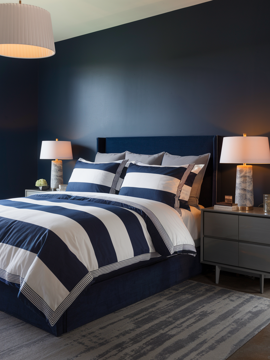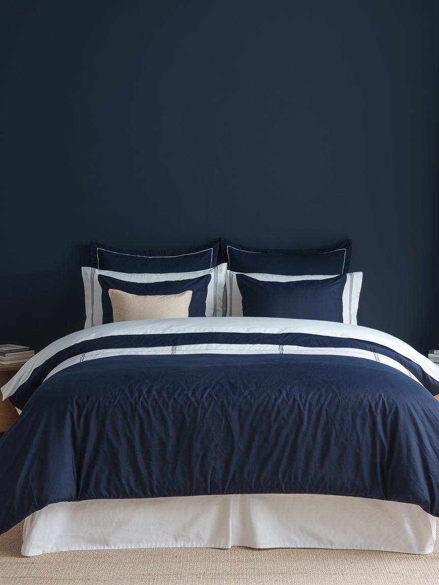 5. Navy Walls with Soft Neutral Bedding