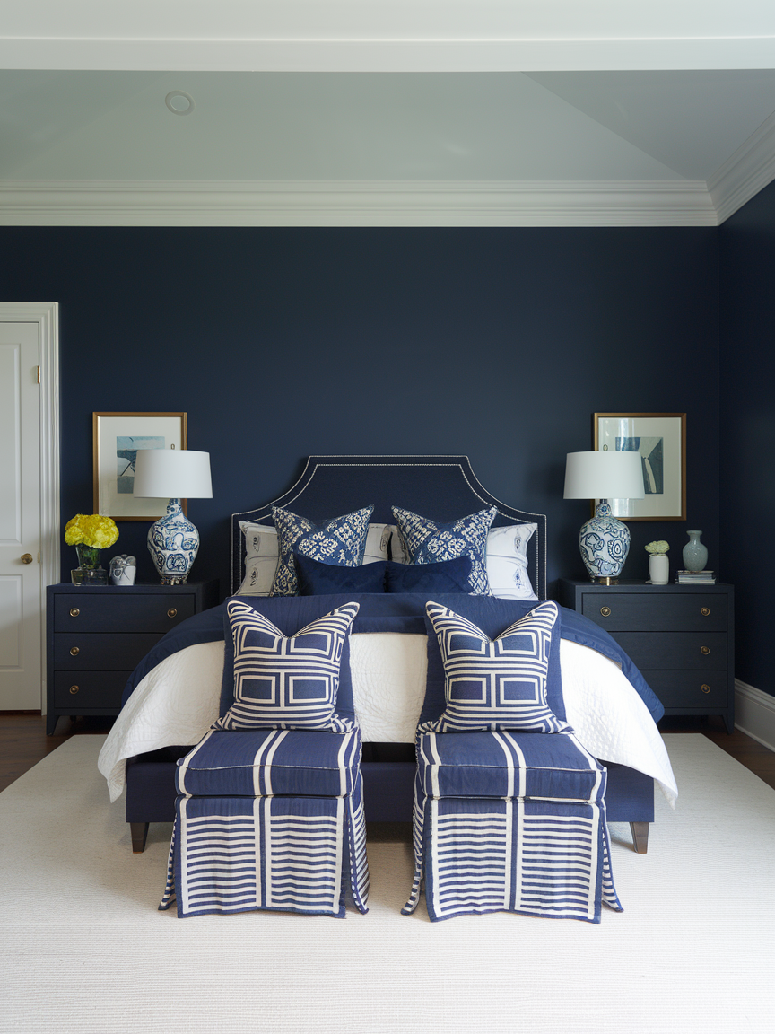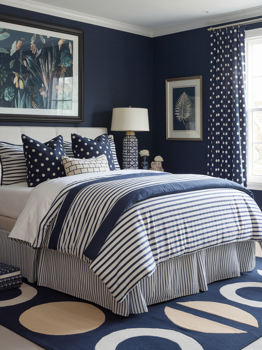 17. Navy Bedroom with Patterned Accents