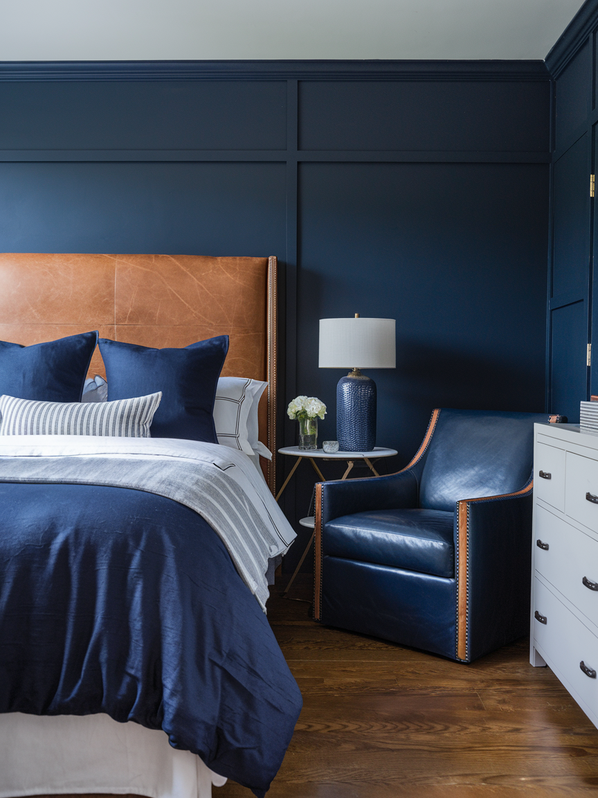 Leather accents add a refined, tactile layer to navy bedrooms, creating a look that feels both timeless and inviting. Warm leather tones, such as tan, cognac, or soft brown, contrast beautifully with navy’s cool depth, introducing balance and visual warmth. Leather headboards, benches, accent chairs, or decorative pillows enhance the room’s texture while adding durability. This combination works particularly well in modern, masculine, or classic interiors, where understated luxury is key. Leather softens navy’s intensity, making the space feel grounded and comfortable rather than formal. Together, navy and leather create a bedroom retreat that feels rich, sophisticated, and effortlessly stylish.